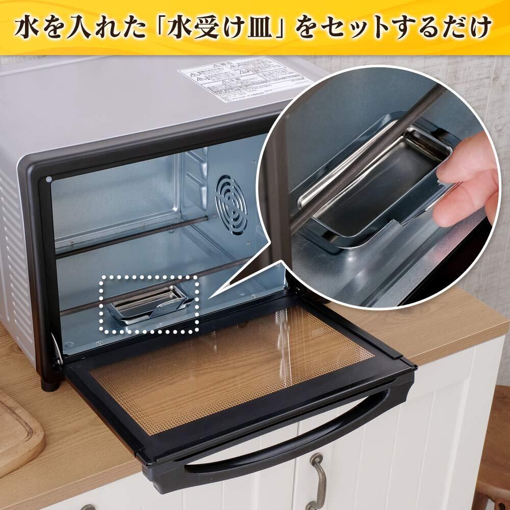 【スチーム機能搭載】 ・スチームでうるおいを与え、食パンやクロワッサン、フランスパンなど、外はサクッと中はふんわり焼き上げます。 ・水受け皿をセットして水を入れるだけの簡単調理。水受け皿は丸洗い可能なのでいつも清潔に使えます。