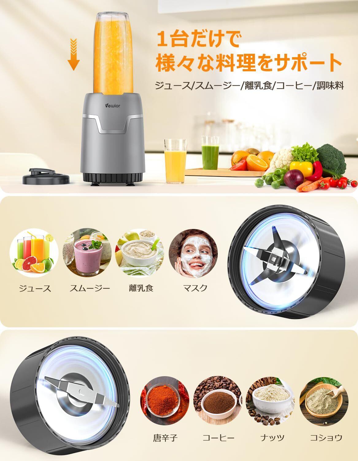 ✨【多彩な使い方で毎日を豊かに!】「VEWIOR ジューサー ミキサー」は、スムージーやジュースだけでなく、コーヒーミルや離乳食作りなど、1台で幅広い料理に対応可能な夢の機器です!日々の健康を手軽にサポートします。