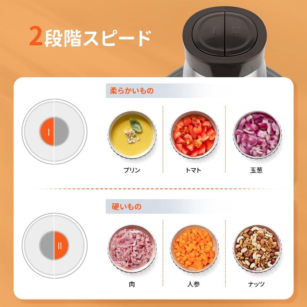 ✨段階スピード調整が可能で、食材に応じた細かさを選べます。ガラス容器と304ステンレス鋼容器の2種類がセットになっているので、調理中はもちろん、保存にも便利です。使い終わった後も、簡単にお手入れできる設計です。