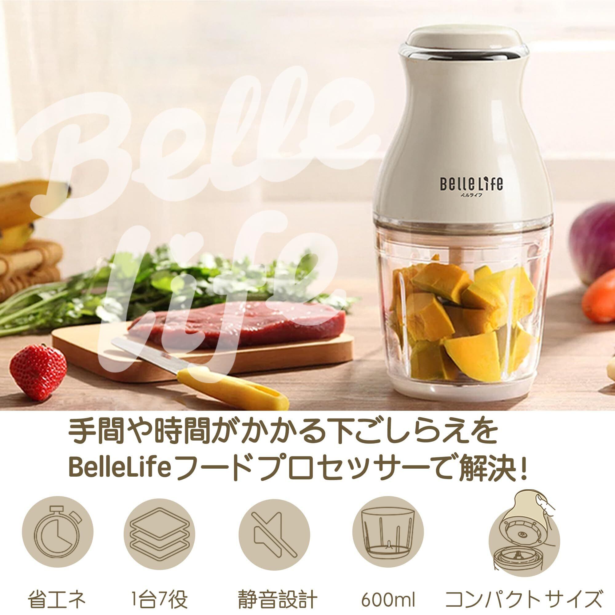 【食品級な素材&料理を時短】BelleLifeフードプロセッサー本体は防錆、安全の304食品級ステンレス・ABS樹脂で作られ、手触れがよくて、長く使い続けても傷や匂いが付きにくく、汚れを落としやすくて衛生面でも安心です。ボウルは丈夫な食品級の強化ガラス製なので、普通のガラスより割りにくくて子供やお年寄りにも安心に使用できます。しかも、透明性が高いボウルで食材の仕上がりを見ながら切ることもできます。また、600ml容量なので、食材は少量でも完全にみじん切りにすることができ、一人分の料理には最適です!そして、普通に食材を下ごしらえ時、何度も刻んで時間がかかり、周りに食材が飛び散って片付けが面倒です。フードプロセッサーを使えば、野菜、肉、魚、唐辛子、などの様々な食材を素早く粉砕でき、今まで難しいと思っていた料理も手間がかからないなります。