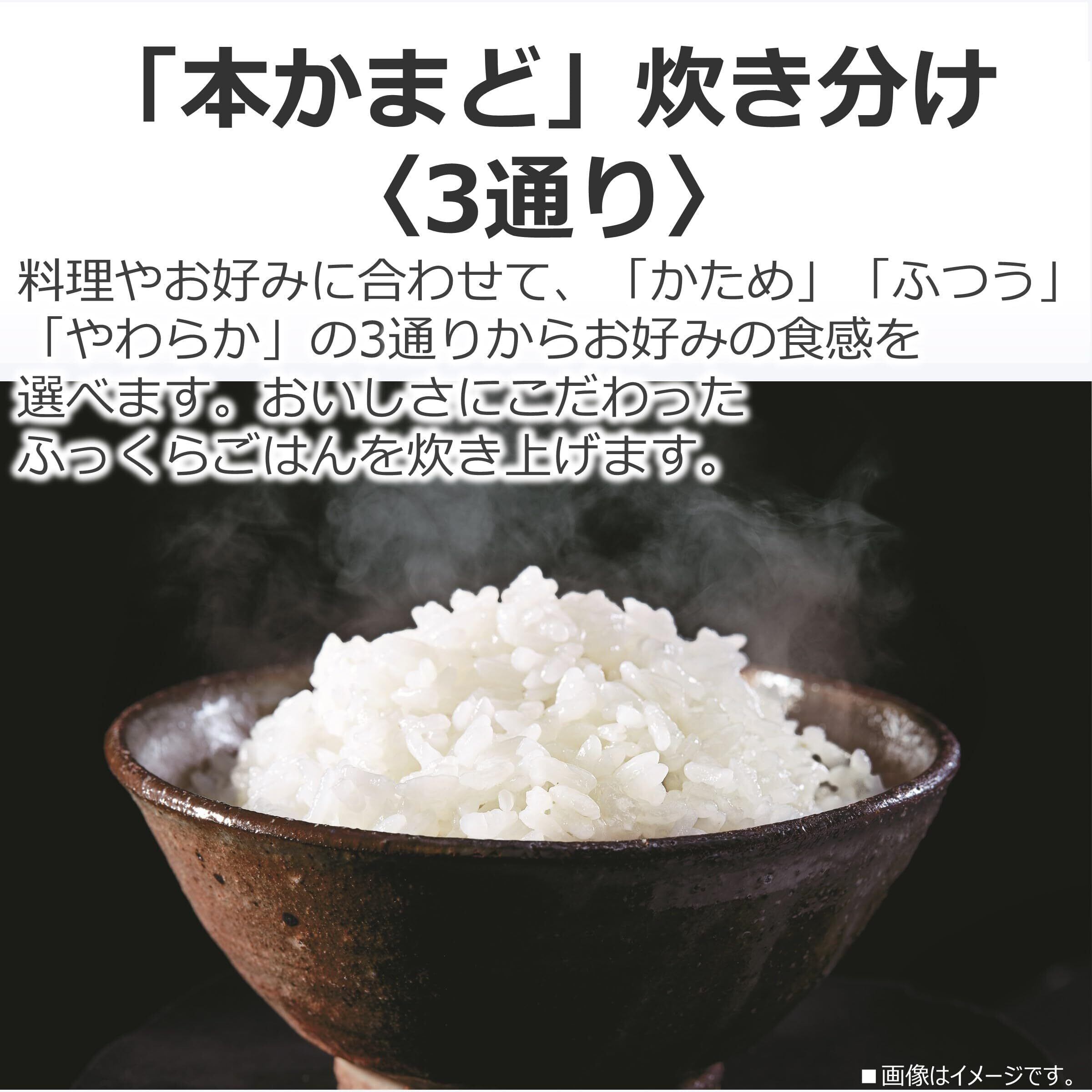 【食感炊き分け】お好みの食感が選べます。【内釜3年】期間内に内側のフッ素樹脂コーティングがはがれた場合は新品とお取り替えいたします(取扱説明書の記載事項にそわない使い方をした場合は対象外となります)。