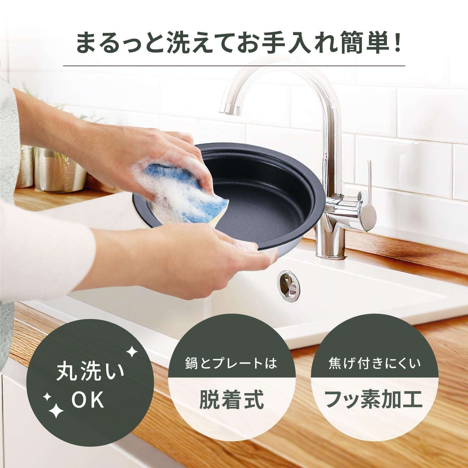✨フッ素加工されているため、焦げ付きにくく、使用後のお手入れも簡単です。鍋やプレートは着脱式で、丸洗いができるので、清潔に保つ手間が軽減されます。忙しい方にも最適なデザインです。