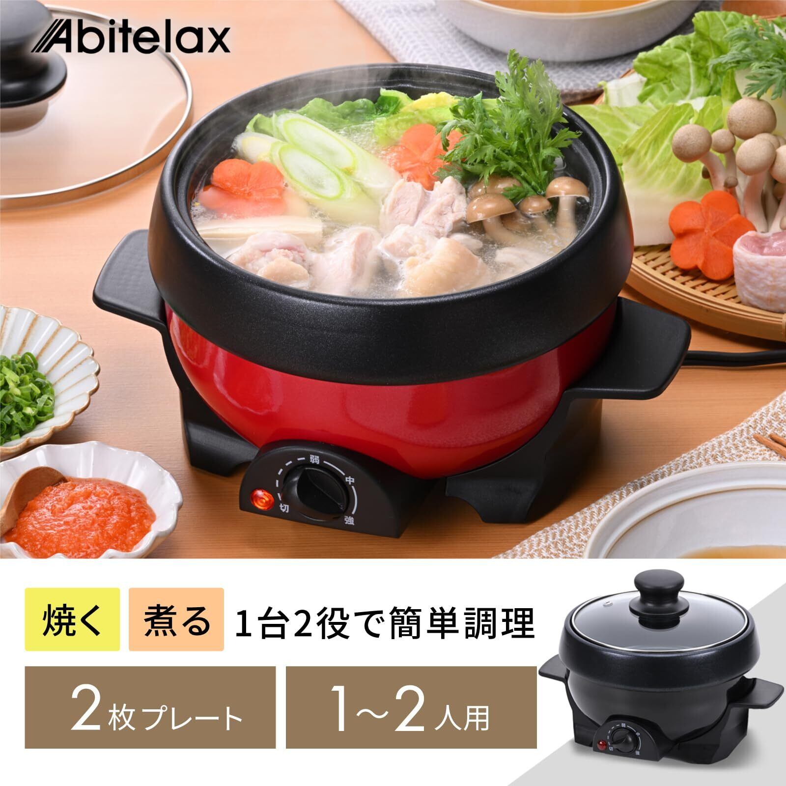 アビテラックス 電気鍋 グリル鍋 電気ミニプレート 1人用 1台2役 「煮る」「 焼く」 小型 一人暮らし 深鍋 おしゃれ 着脱式 丸洗い フッ素加工 レッド abitelax