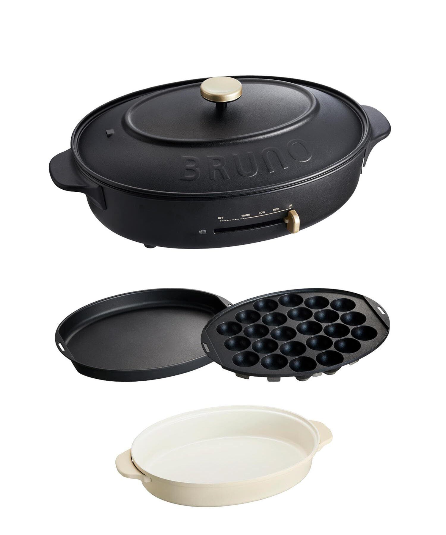 BRUNO ブルーノ オーバルホットプレート 本体 プレート3種 (たこ焼き 深鍋 平面) ブラック Black 黒 おしゃれ かわいい これ1台 一台 蓋 ふた付き 1200w 温度調節 洗いやすい 1人 2人 3人用 小型 ひとり暮らし にも 父の日 プレゼント ギフト 贈り物 BOE053-BK