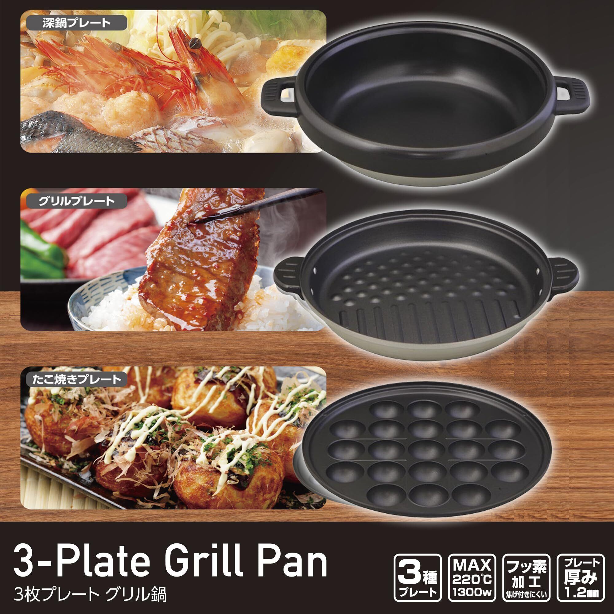 電気グリル鍋 3枚プレート 深型 脱着式 ガラス蓋 3~4人用 鍋深さ7.5cm 1300W [深なべ・グリル・たこ焼 プレート3枚付き] グリル鍋 電気鍋 2人用 一人用 電気 4人用 グリル プレート 蓋付き パン 魚 キッチン ホットプレート 大型 鍋 焼肉 一人暮らし 二人暮らし フッ素加工コーティング 電気鍋 グリルなべ d000