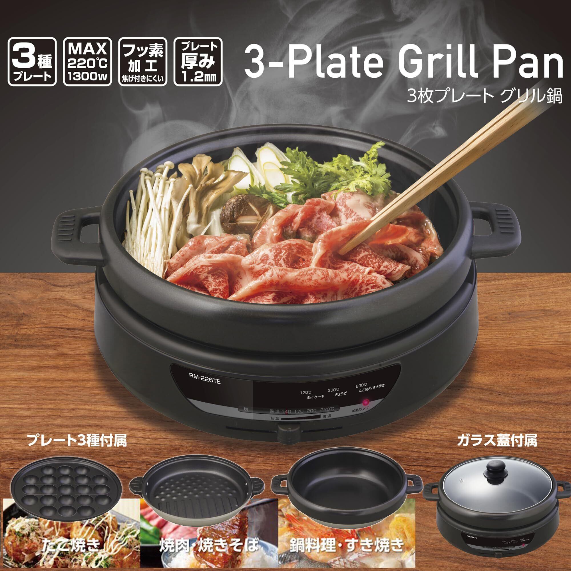 \【◆電気グリル鍋】【3枚プレート】【深型】【脱着式】【ガラス蓋】【3~4人用】【鍋深さ7.5cm】【1300W】【深なべ・グリル・たこ焼プレート3枚付き】/家庭で楽しむ多彩な料理が叶う、機能性抜群の電気鍋が登場!