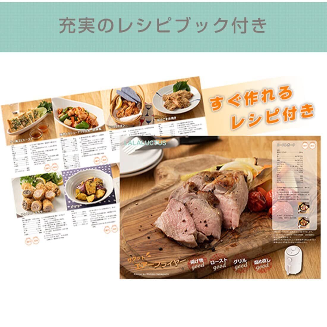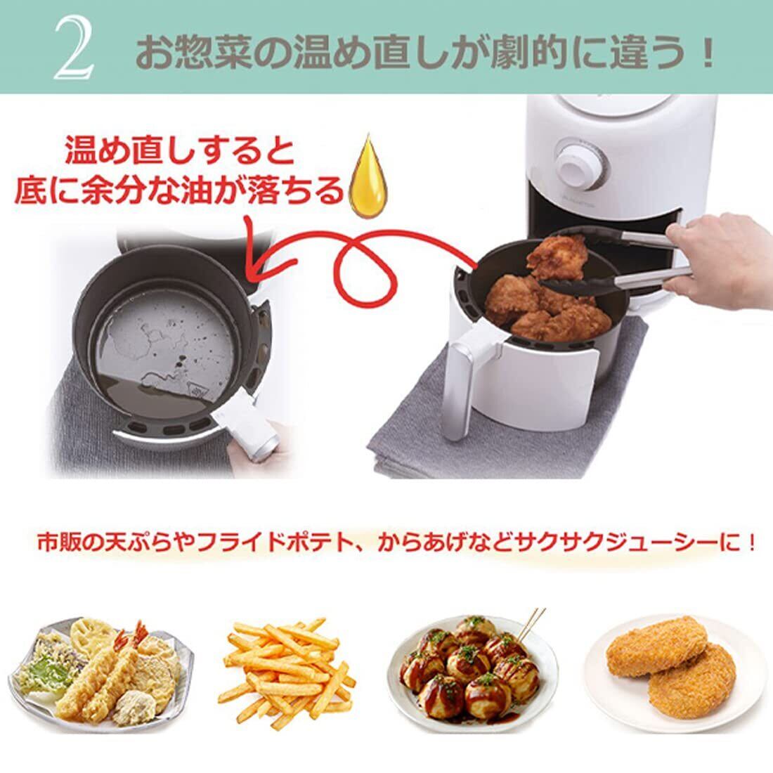 ●200℃の高温熱風で食材全体を加熱することで油を使わずに揚げ物が楽しめるエアーフライヤー。●食材に含まれる水分と油を使い、まるで油で揚げたような食感に仕上げる。●油を使わないので、健康が気になる方には最適。●余分な油がグリルに落ちる仕組みだから、さらにヘルシーに仕上がる。●揚げ物だけではく、グリル、ロースト、お惣菜や天ぷらの温め直しなど、様々な調理に使える。●温め直しをすると余分の油が落ちるので、市販のフライドポテトや天ぷら・からあげなどなサクッとジューシーに。●はじめて使う方でも安心、充実のレシピブック付き。●揚げ物調理の面倒な油始末は不要なので後片付けも簡単ラクラク。●バスケットは丸洗いでき、食洗器にも対応。