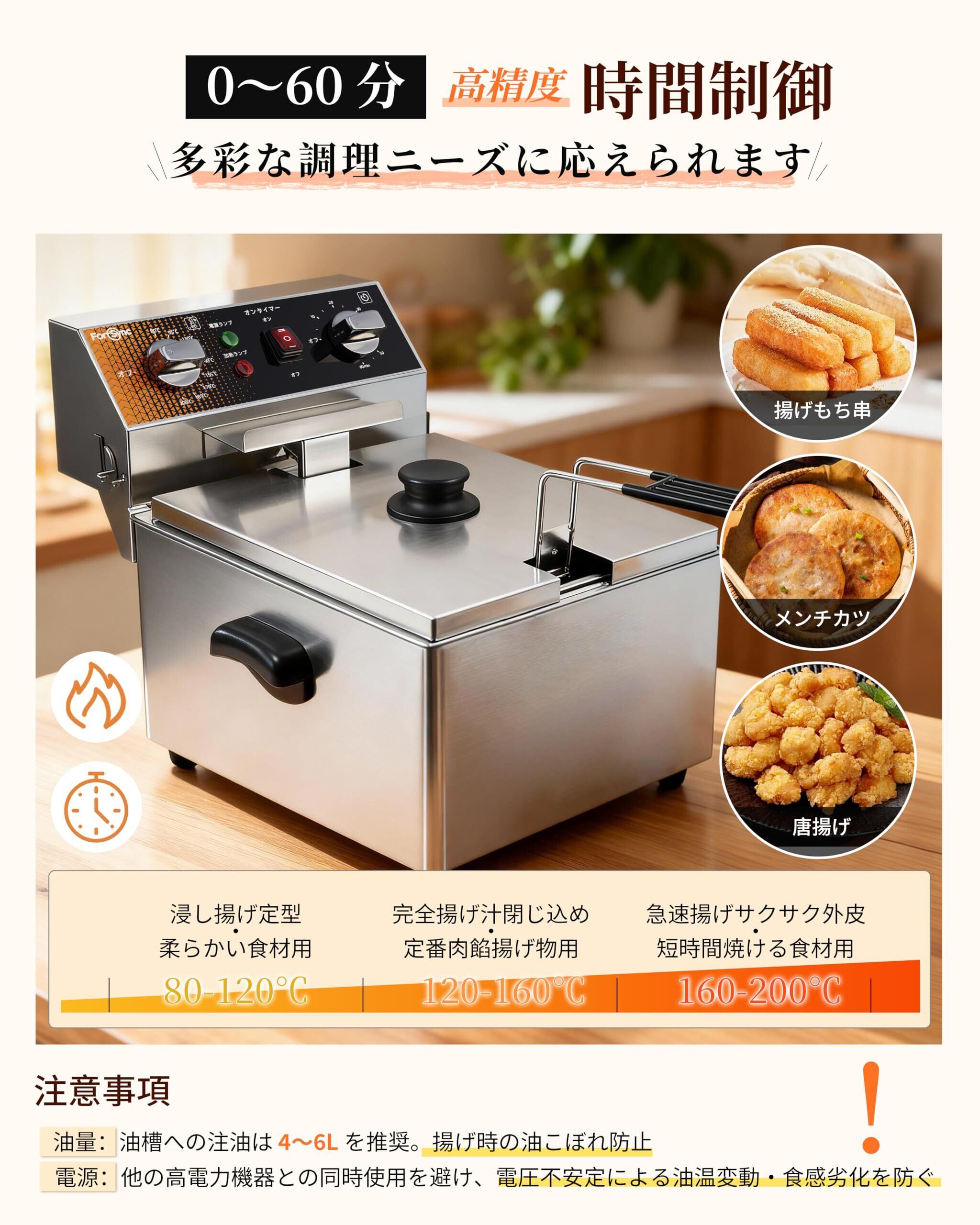 【温度調節とタイマー機能】 80-200℃で温度調節可能、0-60分タイマー付きで食材ごとのニーズに精密対応。恒温機能でサクサク食感を確保し、天ぷら・フライドポテト・串揚げなどの揚げ物を手軽に作れます。家庭の会食や、レストラン・コンビニ・寿司店などの業務用に最適な卓上フライヤーです。