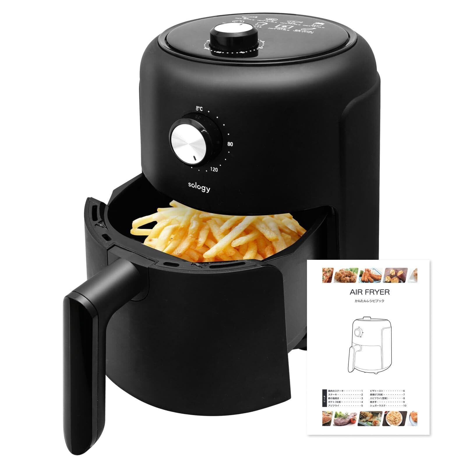 sology(ソロジー) エアフライヤー 2.2L ノンフライヤー 一人用 2人用 小型 オイルカット 揚げ物 フライヤー 専用レシピ付 ポテト 惣菜 ブラック 30日延長カード付