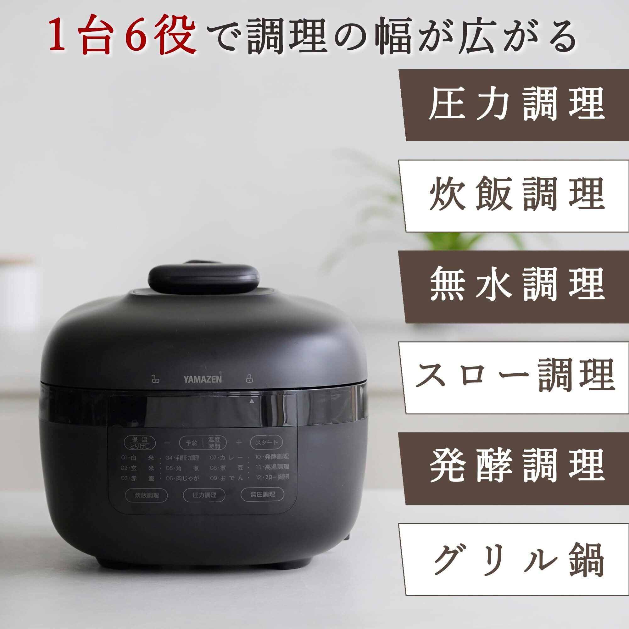 この山善の電気圧力鍋は、シックなブラックデザインが特徴で、どんなキッチンにもぴったりフィット。コンパクトなサイズながらも、多彩な機能を提供し、毎日の料理ライフをさらに楽しくサポートします。