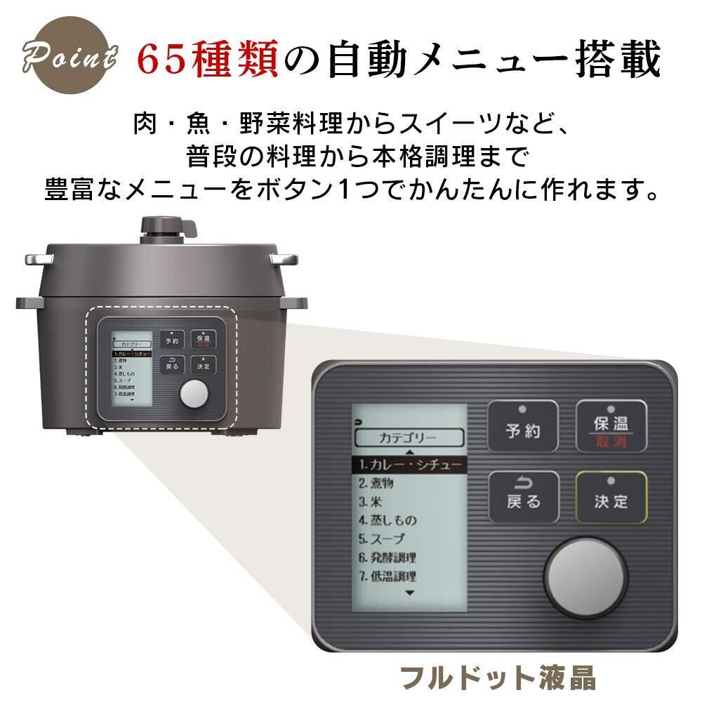 アイリスオーヤマの電気圧力鍋は、ただ材料を入れてボタンを押すだけで、本格的な料理が楽しめます。2.2Lの容量は、一人暮らしや少人数のご家庭に最適で、65種類の自動メニューを搭載しており、毎日の食事作りをサポートします。これ一台で、肉料理、魚料理、炊飯、スイーツまで多彩なレパートリーが実現!