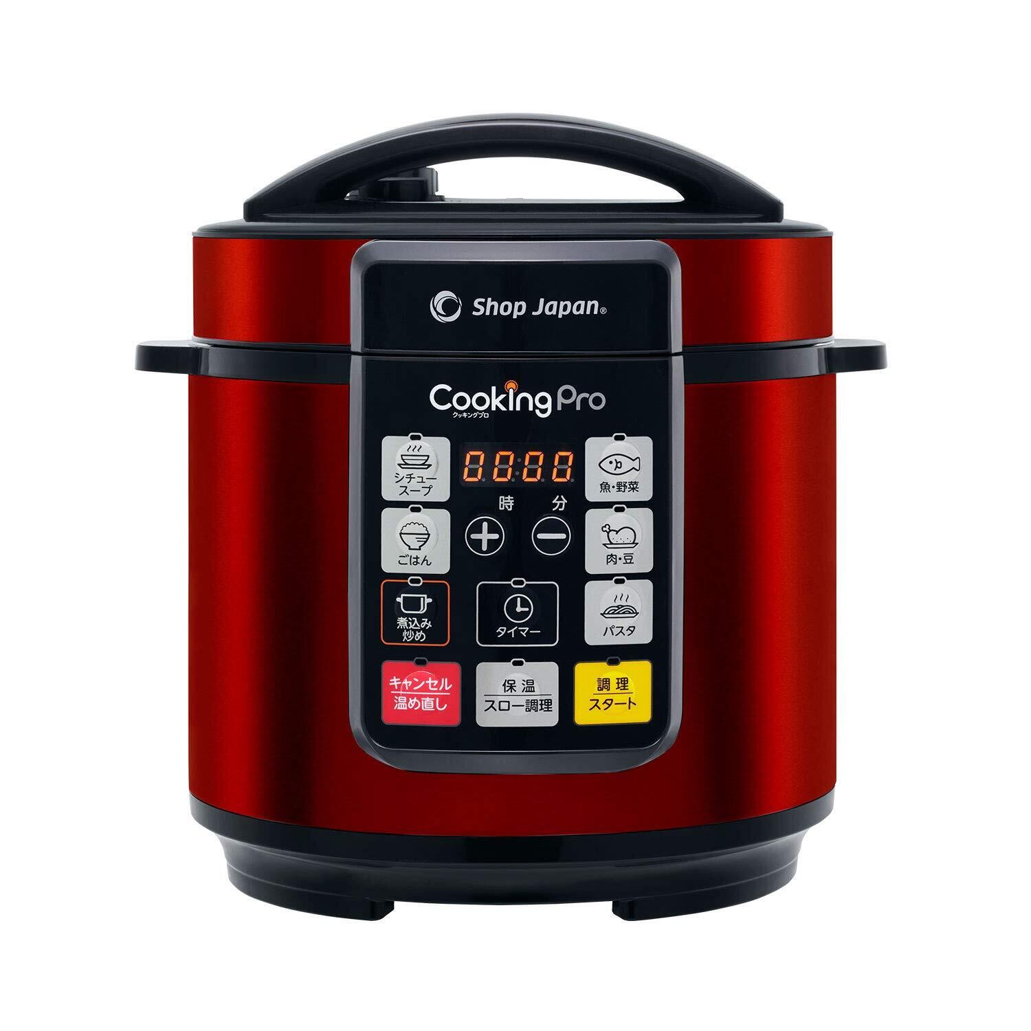 ショップジャパンのクッキングプロは、材料を入れてボタンを押すだけで、圧力調理、蒸し調理、無水調理、スロー調理、煮込み、温め直し、炊飯、炒めと、1台で多様な料理が楽しめます。レッドの鮮やかなデザインも魅力的で、あなたのキッチンを一層明るくします。