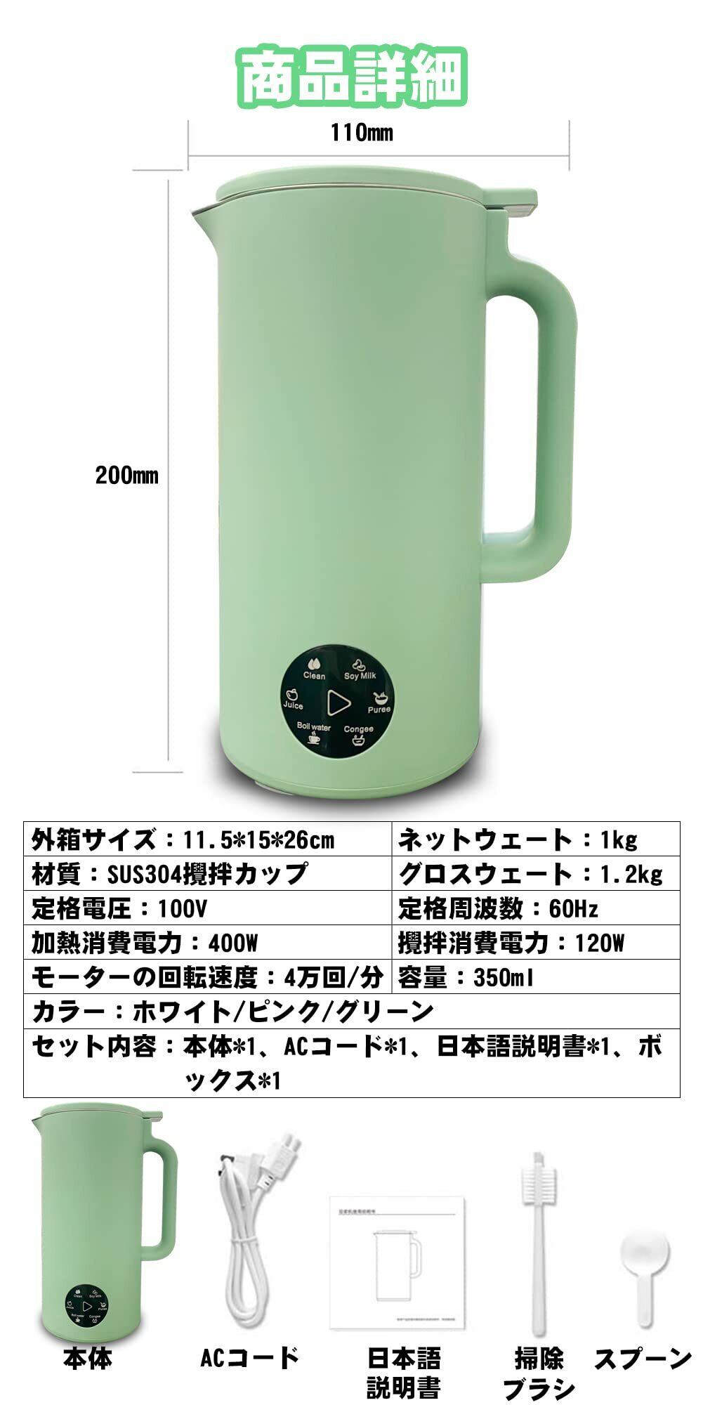本体サイズ:8*11*20cm 外箱サイズ:11.5*15*26cm ネットウェート:1kg グロスウェート:1.2kg 材質:SUS304攪拌カップ カラー:ホワイト/ピンク/グリーン セット内容:本体*1、ACコード*1、日本語説明書*1、ボックス*1