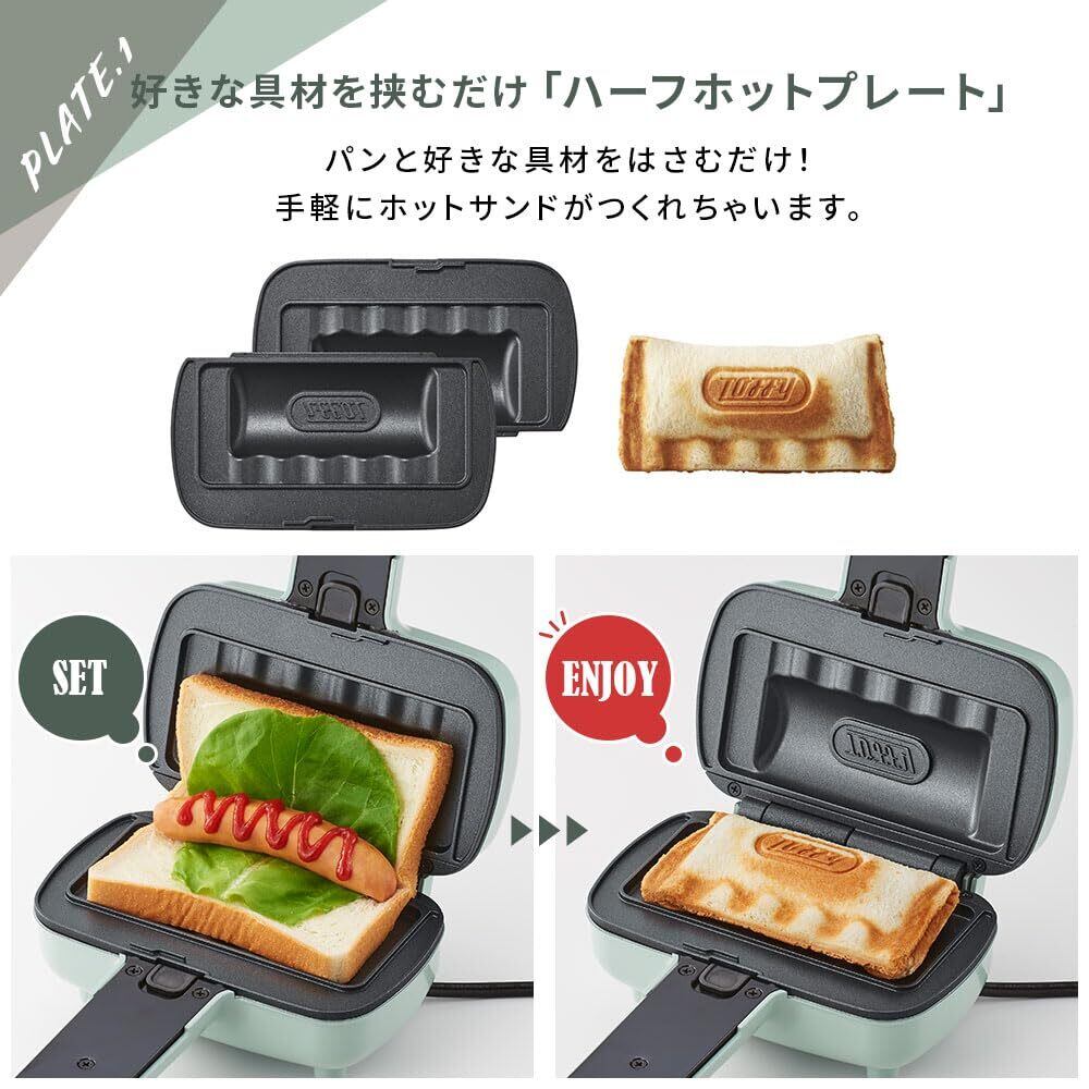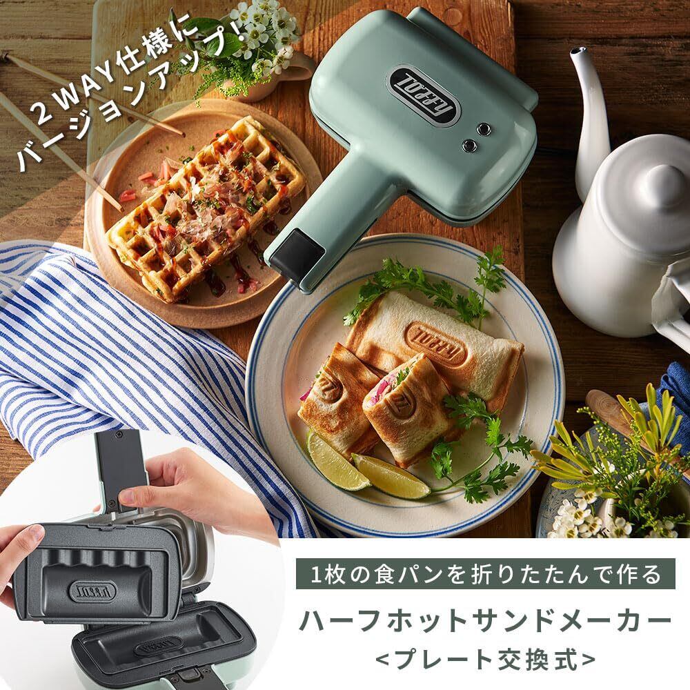 【Toffy ハーフホットサンドメーカー<プレート交換式>】 一枚の食パンを折りたたんで作る“ハーフホットサンド”ができる電気ホットサンドメーカーのプレート交換式! ハーフホットサンドプレートとワッフルプレートが付属した2WAY。バリエーション豊かな別売プレートも
