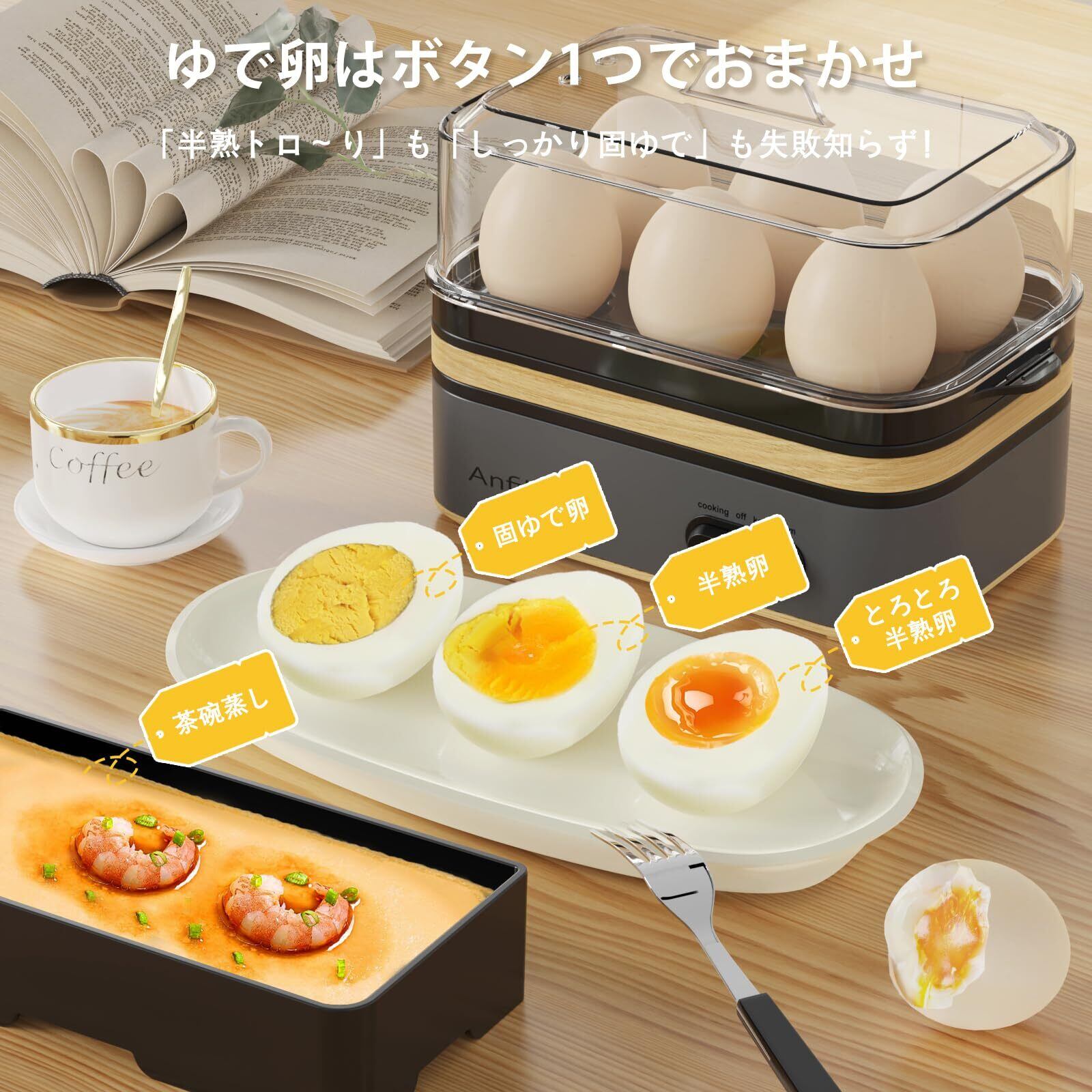 「ゆで卵メーカー」は、自宅で簡単に好みの固さのゆで卵を作ることができる優れものです!スチーム機能を活用して、最高の食感を実現。濃厚な半熟卵から、しっかりした固ゆで卵、さらには茶碗蒸しや蒸し料理まで、幅広いメニューをお楽しみいただけます。