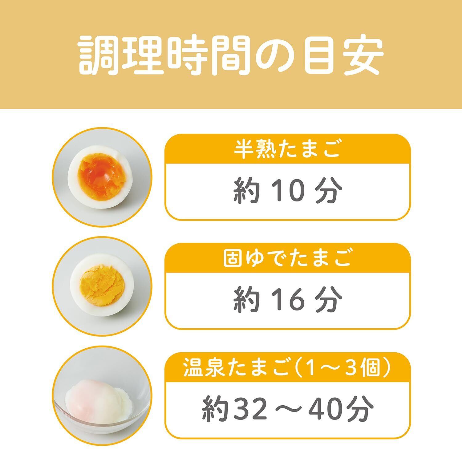 ●調理時間の目安:半熟たまご:約10分、固ゆでたまご:約16分、温泉たまご(1~3個):約32~40分