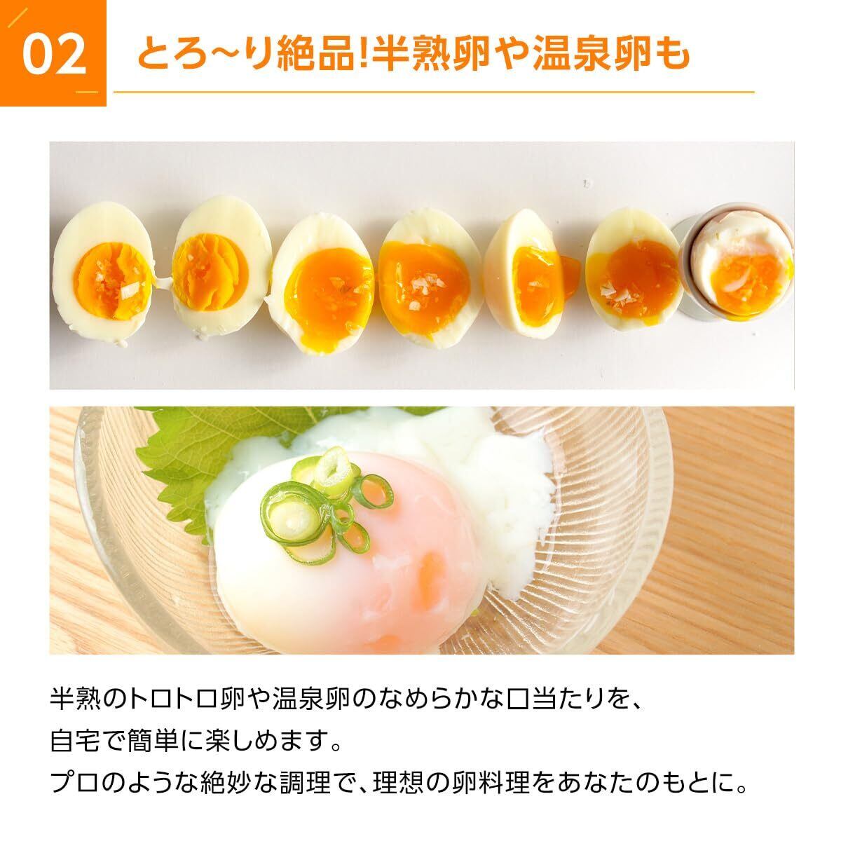✨一度に5個のゆで卵や、最大3個の温泉卵をつくることができ、料理の幅が広がります。ゆで加減もお好みに調整可能で、家庭の食卓をより豊かにします。