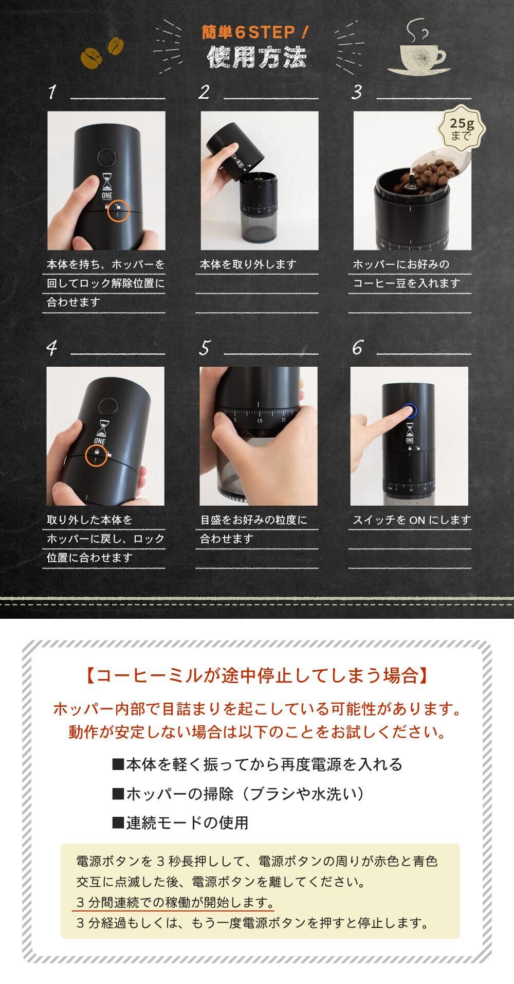 『コンパクトで持ち運びラクラク』電動タイプでも省スペースです。バッグに入れて持ち運びも楽々。USB充電のコードレスタイプで、おうちでもアウトドアでも使う場所を選びません。『分解して水洗いOK』モーター部分を外し、ホッパーと粉受けを水洗いできて衛生的!気軽にお手入れ可能なお掃除ブラシも付属しています。