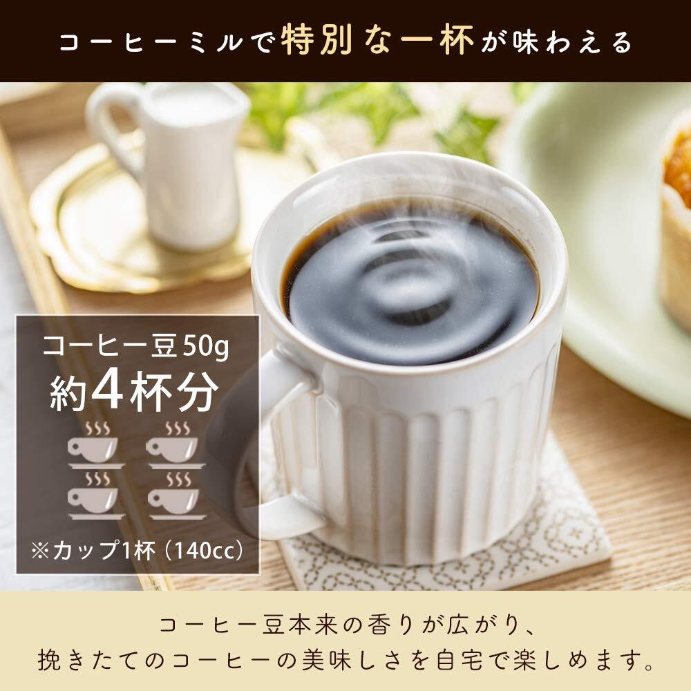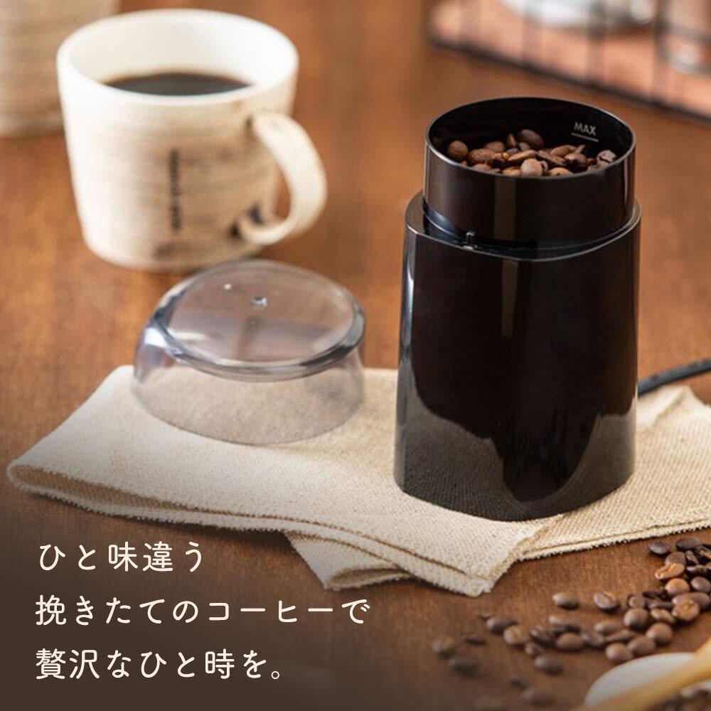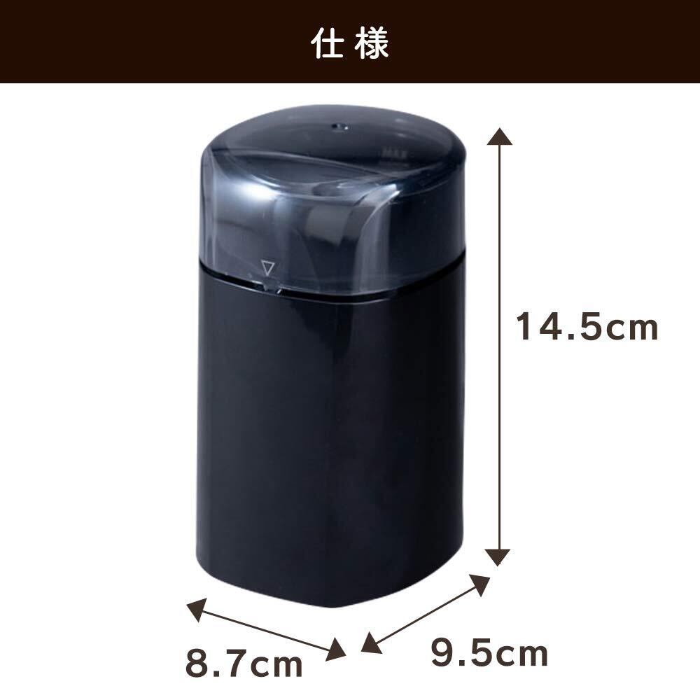 雑味の少ない香り深いコーヒーでぜいたくな時間をお楽しみください。【商品仕様】商品サイズ(cm):幅約8.7×奥行約9.5×高さ約14.5、製品重量(kg):約530g、材質:本体 プラスチック+SUS、蓋(透明) AS、カッター刃 sus301、掃除ブラシ(毛) PE、電源:AC100V 50/60Hz、定格消費電力:150W、MAX投入量:50gまで、カッター刃回転数:26000±15%rpm、連続運転時間:45秒(連続回転後は2分休止)、電源コード長さ:約1m、付属品:お手入れブラシ