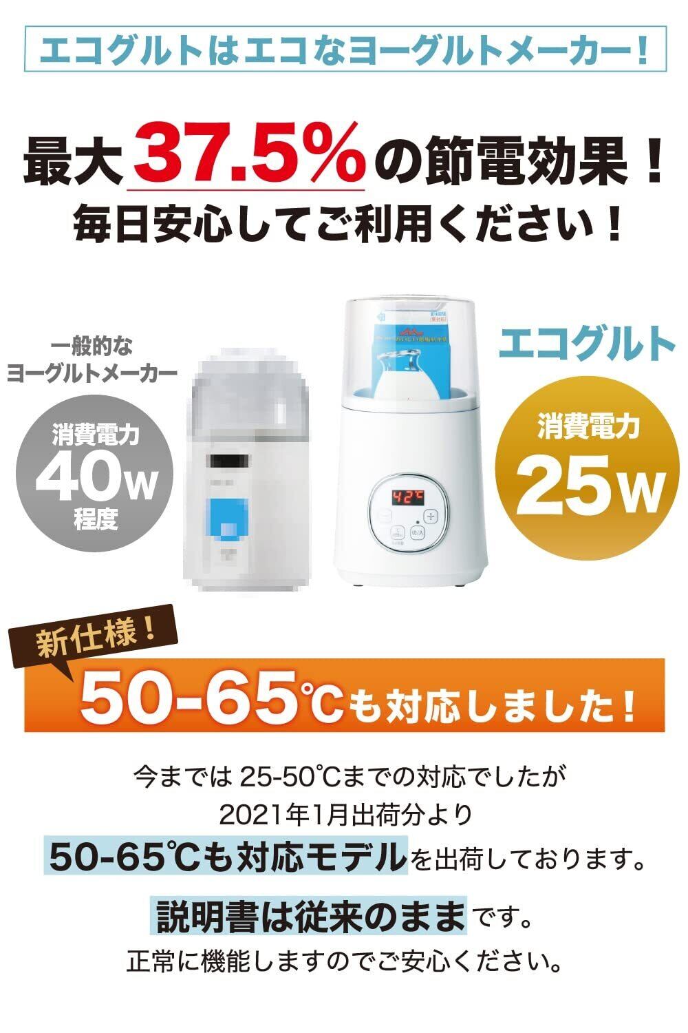 2021年1月出荷分から最大65℃まで対応しました。説明書には50℃の記載がありますが、正常に対応致しますのでご安心くださいませ。エコグルトは独自制御プログラムで日本の牛乳パックに特化した圧倒的な温度安定性を誇るヨーグルトメーカーヨーグルトメーカーで最も重要なのは温度を正常にキープできるかという事。エコグルトは温度安定性を徹底的に追及し、複数回の調整を踏まえ温度差4.0℃以内に収まるように調整されています。驚く事に平均的なヨーグルトメーカーは42℃発酵の際に5.0℃~10.0℃程ずれるケースが多く見られます。42℃発酵で4.0℃以上ずれる場合はいかなる理由でも返品・交換をお受け致しますご安心してご利用ください。