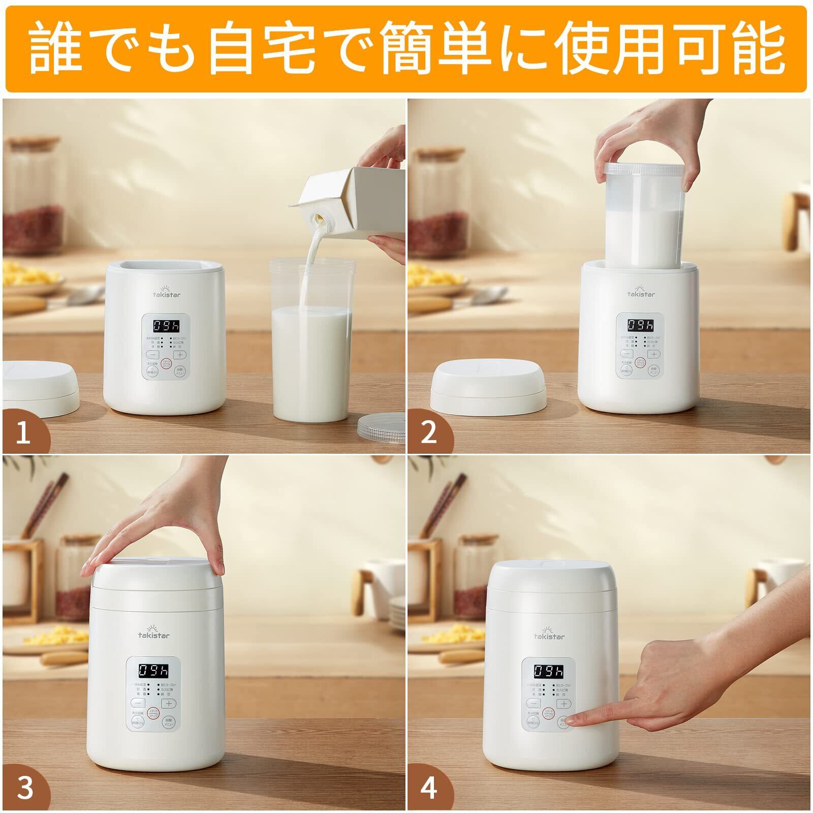【日本向けに設計を一新】こだわりのポイントがいっぱい。長すぎず、短すぎず、実使用を考えてちょうど良い長さ(1.5m)の電源コードを採用;自動メニュー搭載。材料を投入して、ボタンを押すだけで自動で時間と温度が設定されます;伸縮ふたを搭載で、引き伸ばせば1000mlの牛乳パックがそのまま使えます。付属の800ml容器で足りない場合に便利です。PSE認証;日本国内品質とサービス