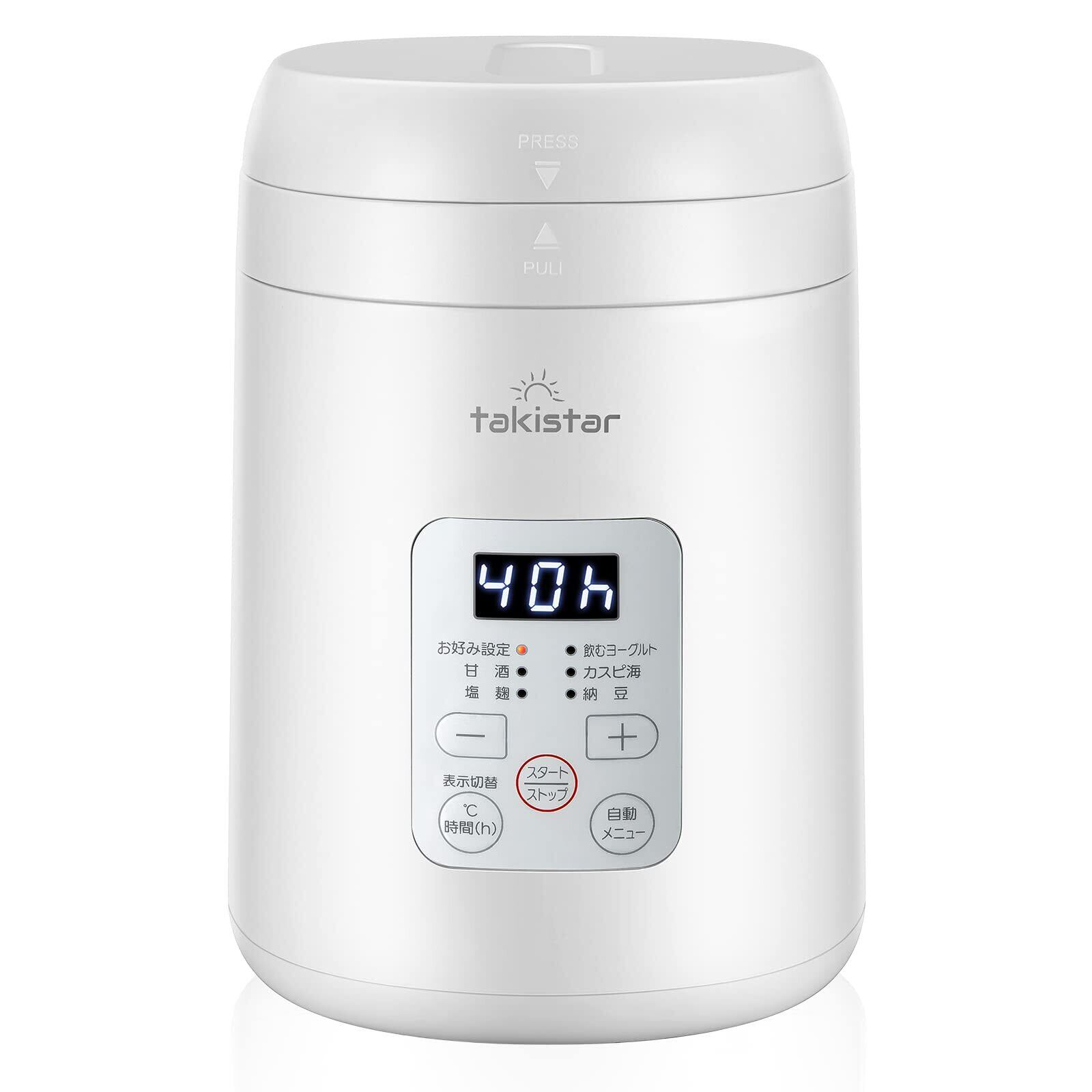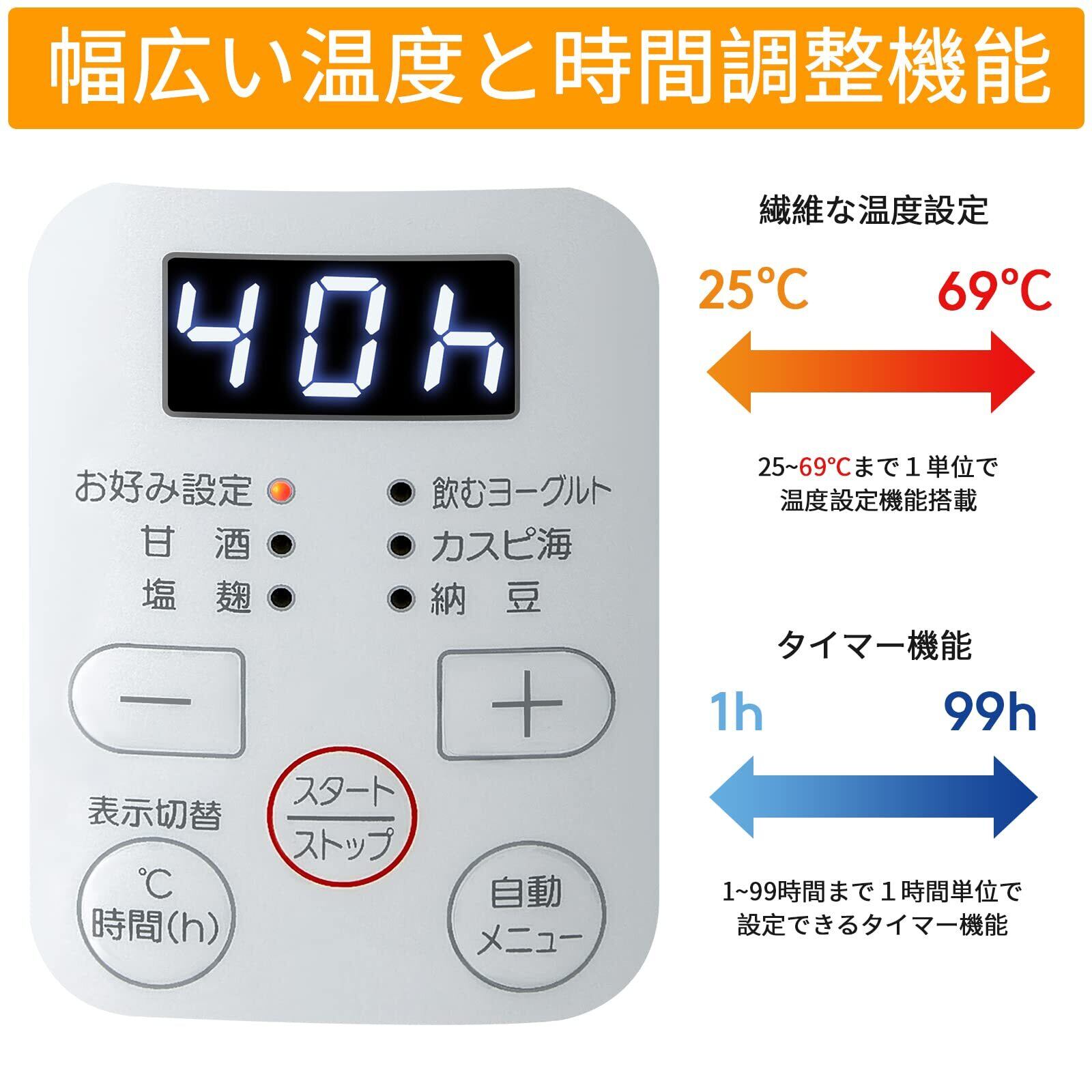 【温度と時間設定機能】市場では最高温度65℃くらい、48時間まで設定可能のものが多いですが、いろいろな温度範囲と時間範囲の低温調理をしたいお客様の声によって、は独自の立体加熱構造で69℃、99hまでに改良しました。幅広く温度と時間を設定できるので、ヨーグルトだけではなく温泉卵、甘酒や麹など多彩な発酵食もお家で作れます