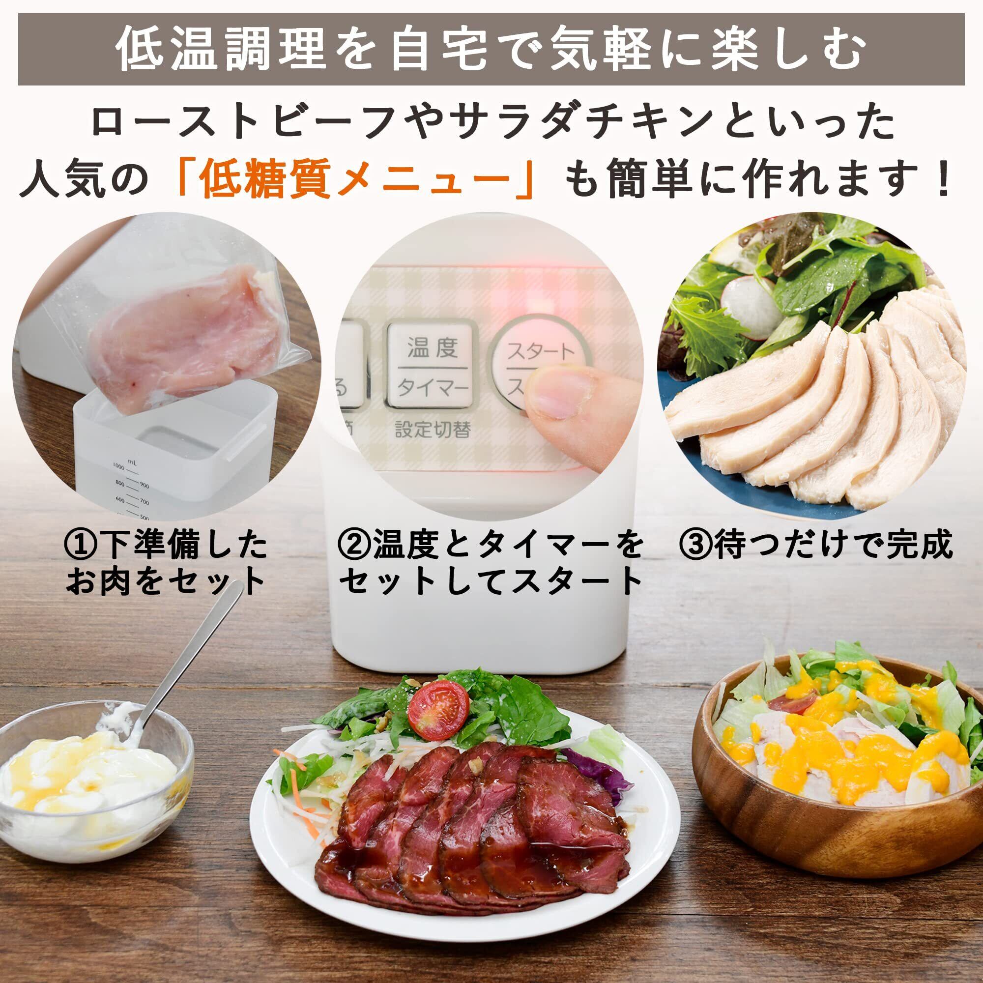 【低温調理をご家庭で】ヨーグルト・発酵食品だけでなく低温調理も可能なので、サラダチキンやローストビーフなどの低糖質メニューが作れます。温度調節は25℃~65℃、タイマー調節は1時間~48時間まで設定可能です。