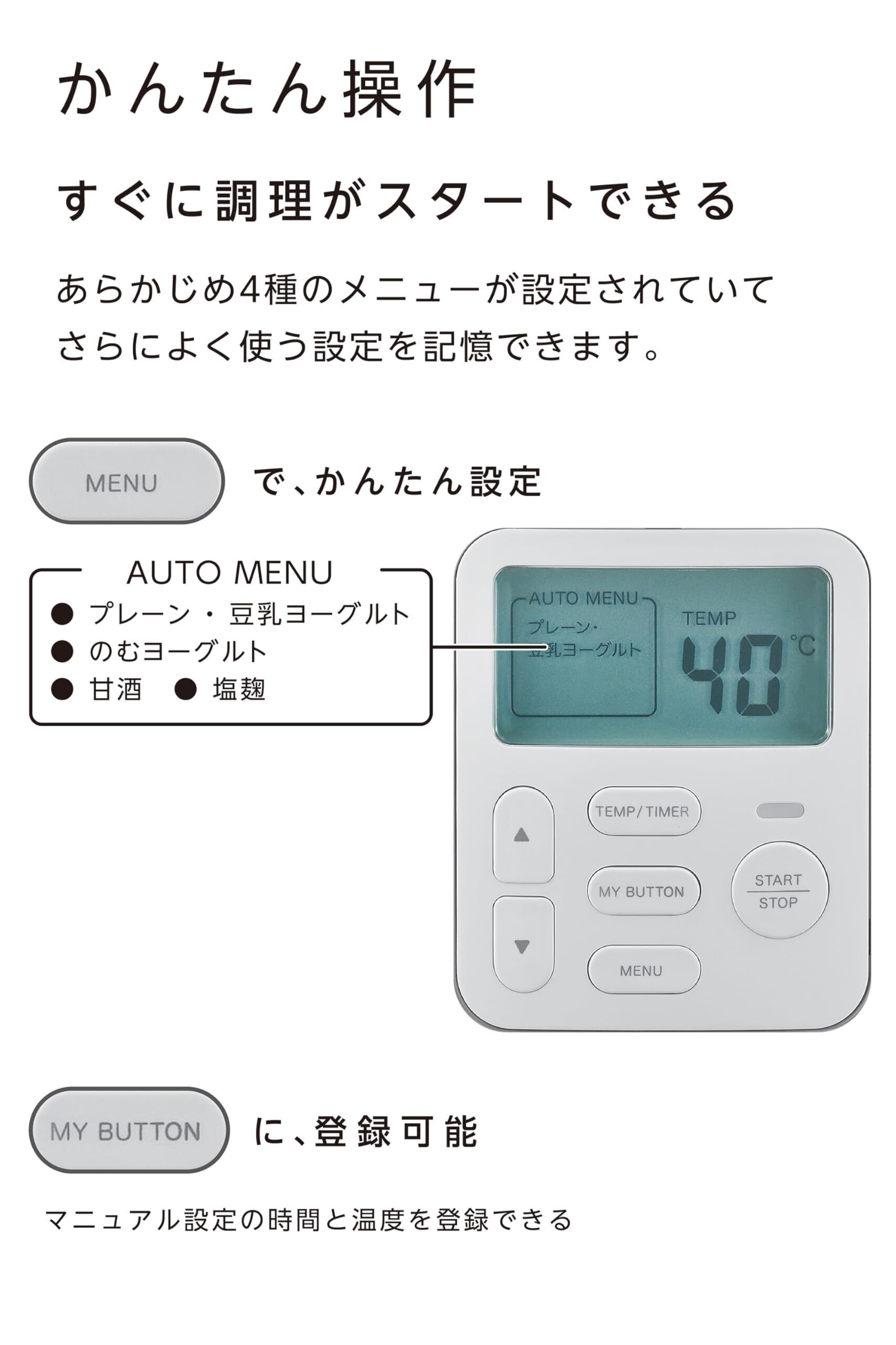 【人気メニュー4種はオートメニューにおまかせ】 「プレーンヨーグルト・豆乳ヨーグルト」「のむヨーグルト」「甘酒」「塩麹」の4種のオートメニューをご用意。難しそうな発酵食品づくりもおまかせでおいしく出来上がります。 また、マニュアルモードなら1℃・1時間刻みで、こまかい設定が可能。 味や食感を自分好みアレンジして、こだわり発酵食品が作れます。 オフタイマー付きだから、電源切り忘れや過発酵を防止できます。
