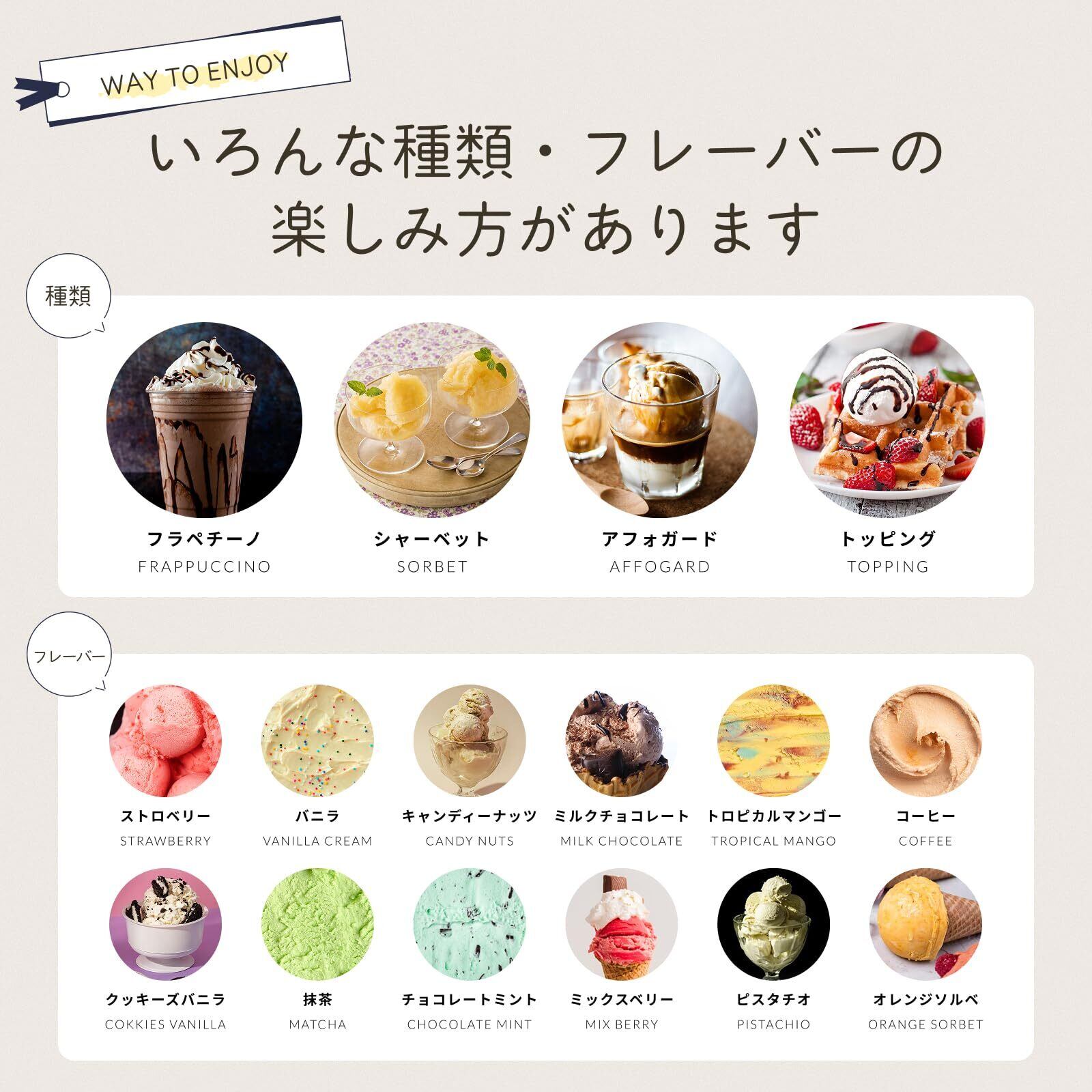 【楽しみ方はアイスだけじゃない】ERUを使うことでアイスクリーム以外にもアフォガートやフラペチーノ、シャーベットなど様々な楽しみ方が広がります。