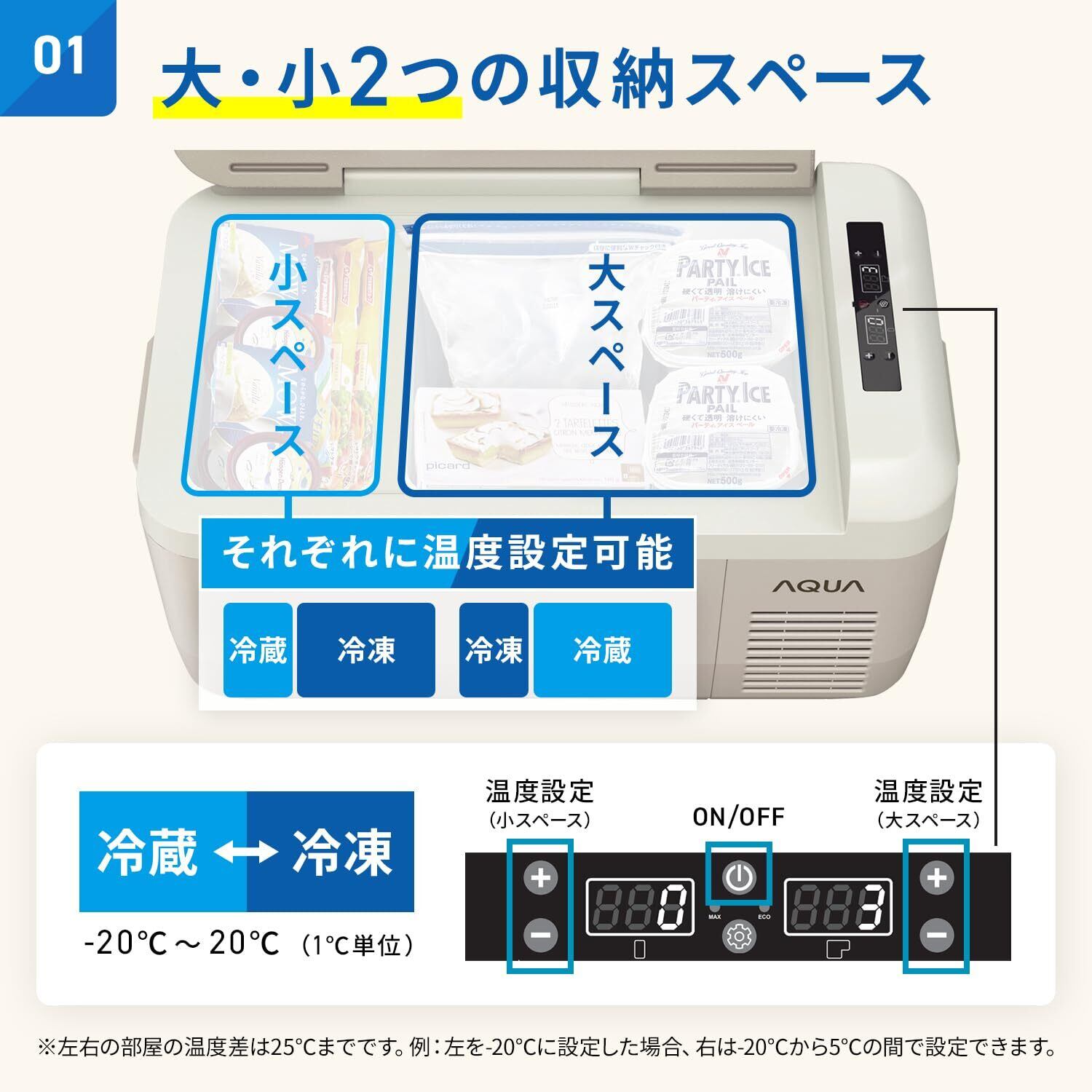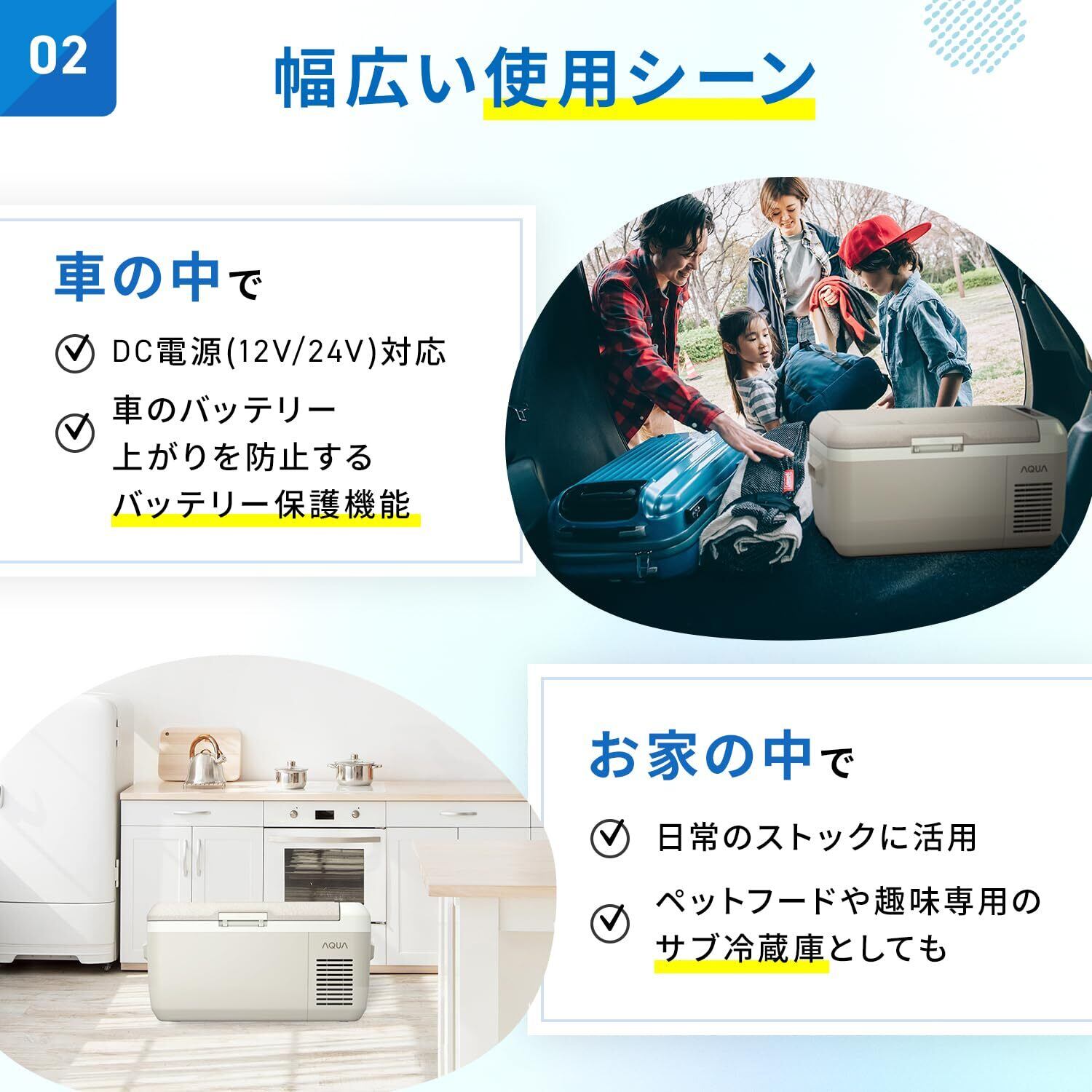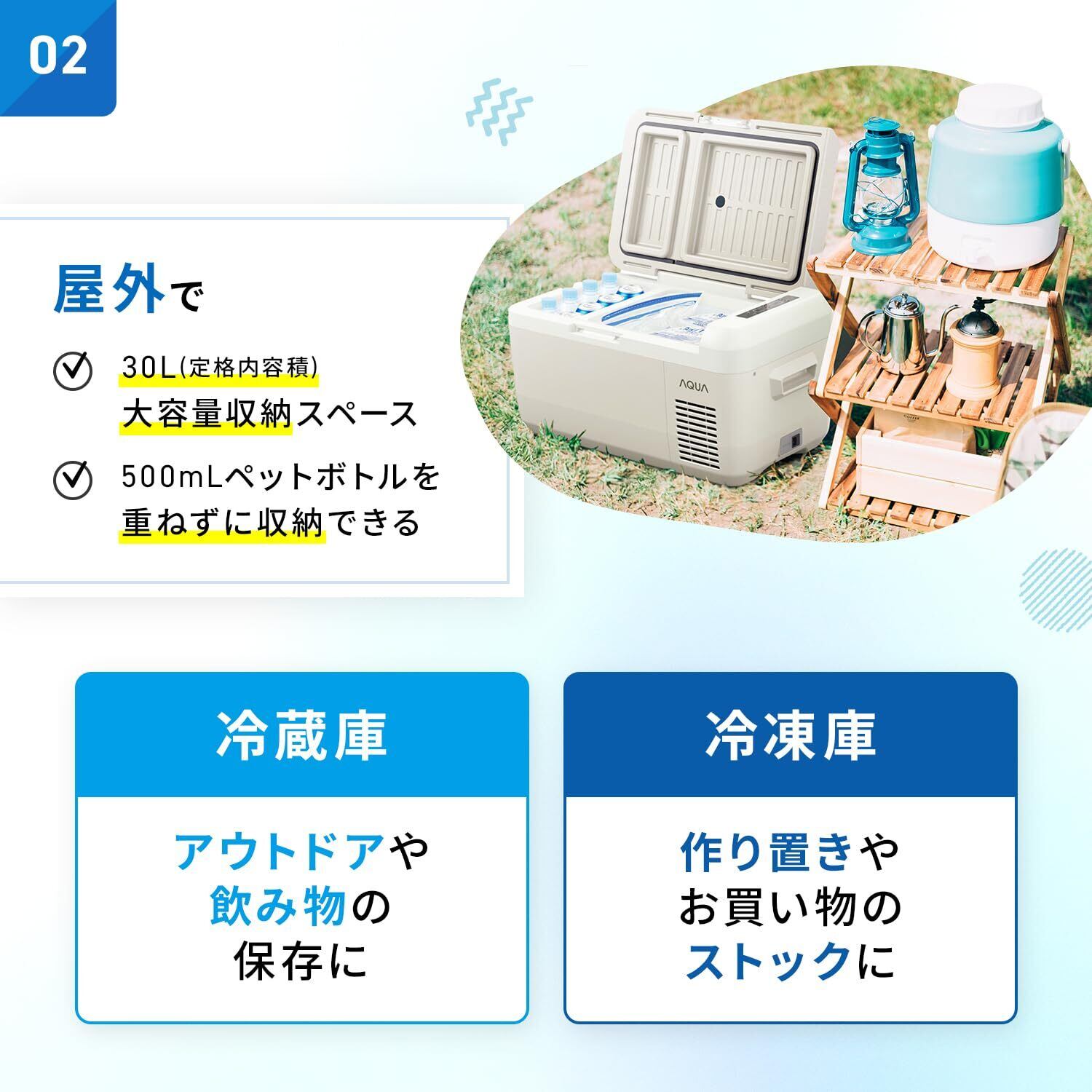 「AQUA 小型冷蔵庫」は、家庭用にも車載用にも最適な30リットルの冷蔵庫/冷凍庫です。冷凍食品やドリンクを手軽に保存でき、幅広いシーンで活躍します。