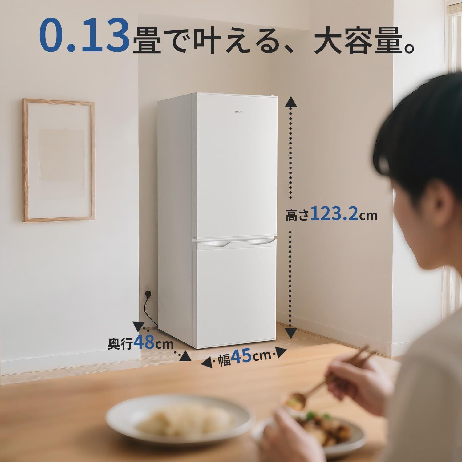 【省スペース超薄設計】 「冷蔵庫を置く場所がない…」→本品は幅わずか45cmの超スリムボディ。キッチンの狭い隙間や細い廊下にもすっきりフィットします。設置に必要な面積は約0.13畳分。マンションやアパートの限られた空間でも、圧迫感を感じさせず、すっきりとお使いいただけます。