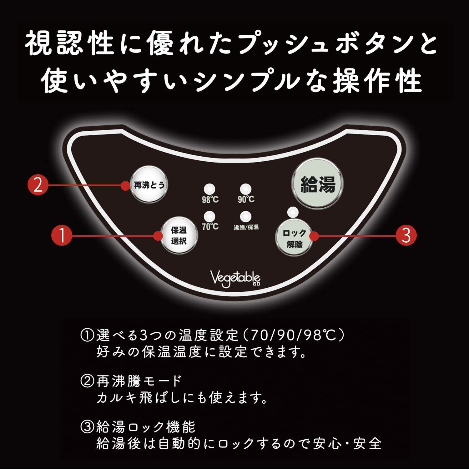 [機能]・再沸騰モード・給湯ロック機能・360度回転ベース・保温温度(98℃・90℃・70℃)・水位窓・シンプルパネル・2way給湯