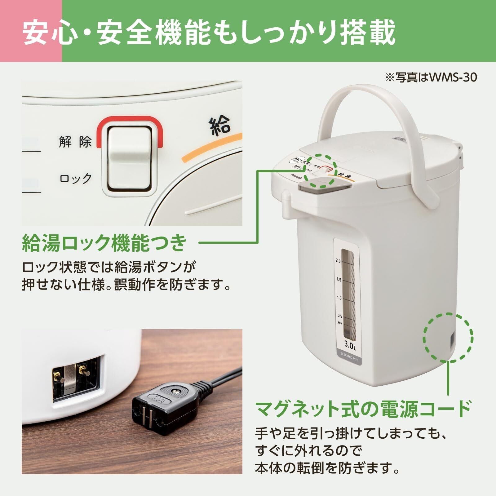 【省エネポット】: 真空断熱材でかしこく節電&上手に保温できる電気ポットです。 【大容量ポット】 : たくさん使える4リットルの保温ポットです。 【電動給湯式】: 操作パネルに角ある給湯ボタンを軽くワンタッチすればお湯が注げるポットです。【カルキとばし機能】: 沸騰時間を自動的に延長し、水道水のカルキとばす機能が付いている沸騰ポットです。【空だき防止】: 内容器に水が入っていない状態を検知して、ヒーターへの通電を自動的に切ります。【押しやすい給湯ボタン】:操作パネルの角に一目でわかりやすい、大きな給湯ボタンで注ぎやすい湯沸かしポットです。【前面注ぎ口】:お湯の出口を分かりやすくするために注ぎ口部分を操作パネルの最前面にもってきています。【本体回転】:本体はクルリと360°回転するので、お手元で注ぎやすくなっています。【マグネット式プラグ】:電源コードはマグネット式で万一コードにひっかけても、すぐに外れる仕様になっているポットです。本体の転倒を防ぎやすくなっています。【プラスチックボディ】: 本体胴部は軽くてサビないプラスチック製なので清潔にご使用できる電気ポットです。