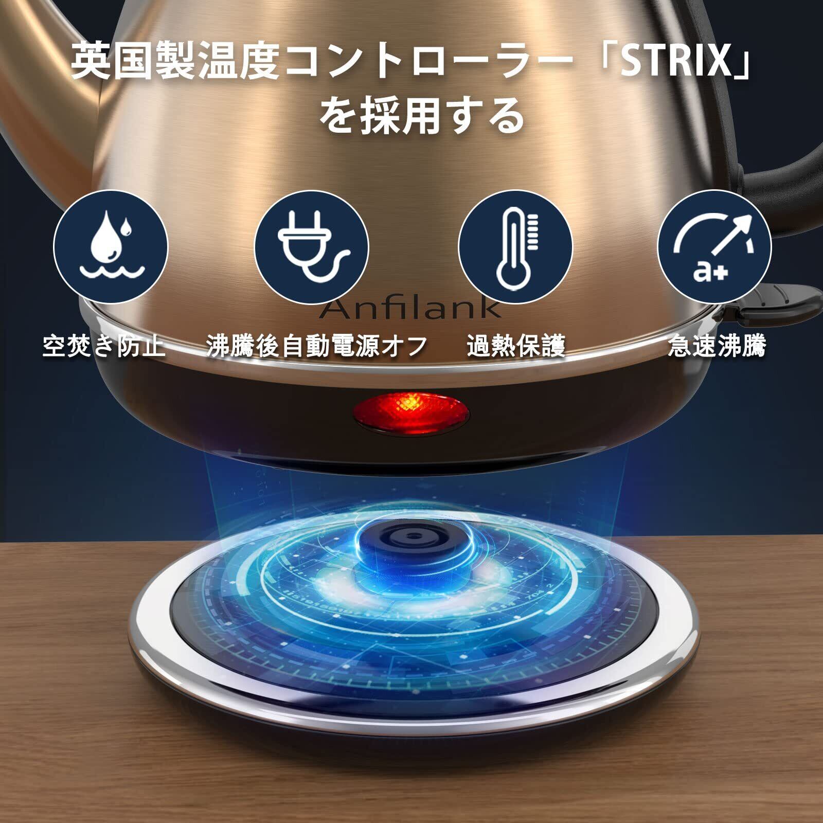 【三重保護・安全の空焚き防止機能付き】Anfilankおすすめ電気ケトルの中核部品には、12,000サイクル以上の寿命を持つ世界最高水準の英国製温度コントローラー「STRIX」を採用します。沸騰後自動電源オフ、過熱保護、空焚き防止、安全安心にご利用いただけれます。空焚き防止機能付きだから、家事などの他の作業をしながら安心してお湯を沸かすことができます。沸かし終わったら自動で電源が切れるので、安全です。