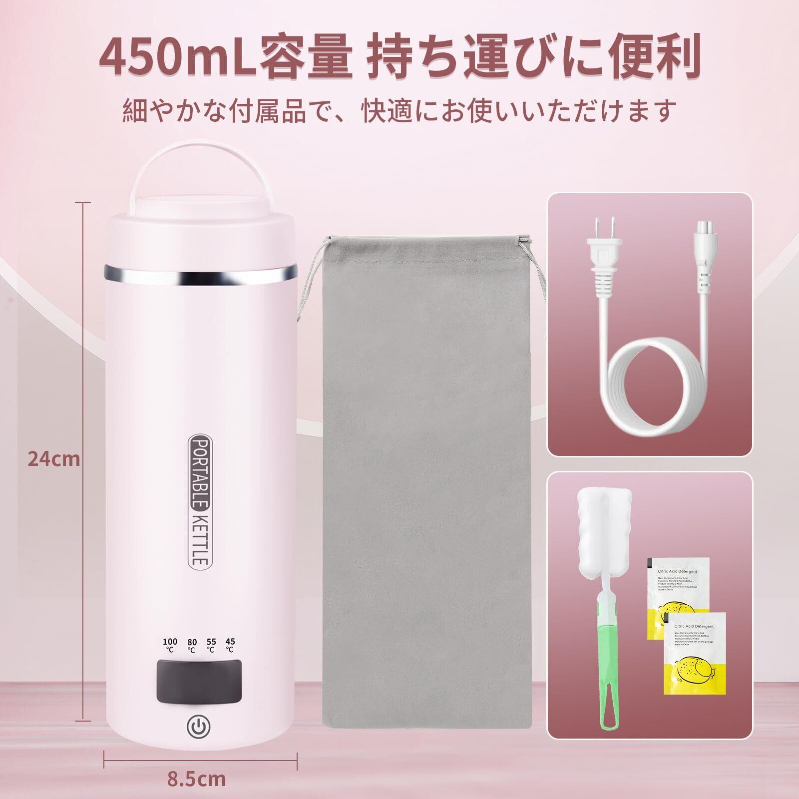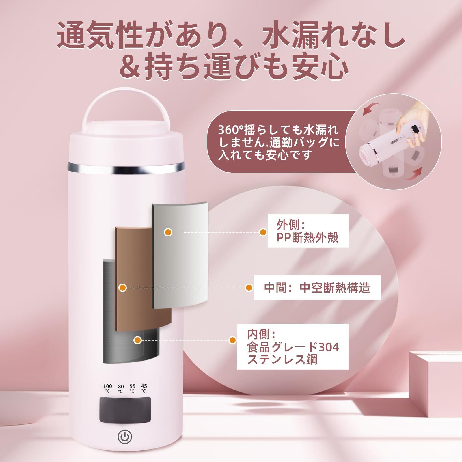 \【◆ポータブル電気ケトル 4つの温度設定 プラグイン式 小型 持ち運びケトル 304食品級ステンレス鋼 トラベルケトル 300W低消費電力 空焚き防止 漏水防止 電気ケトル PSE認証済み 日本語説明書付属(ピンク色)】/おしゃれで便利な湯沸かしをあなたに!