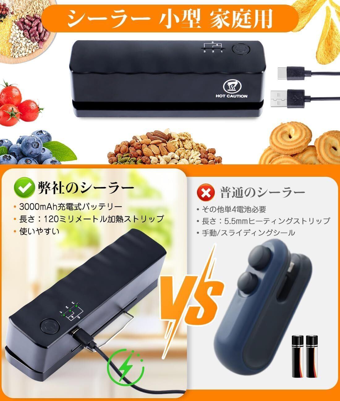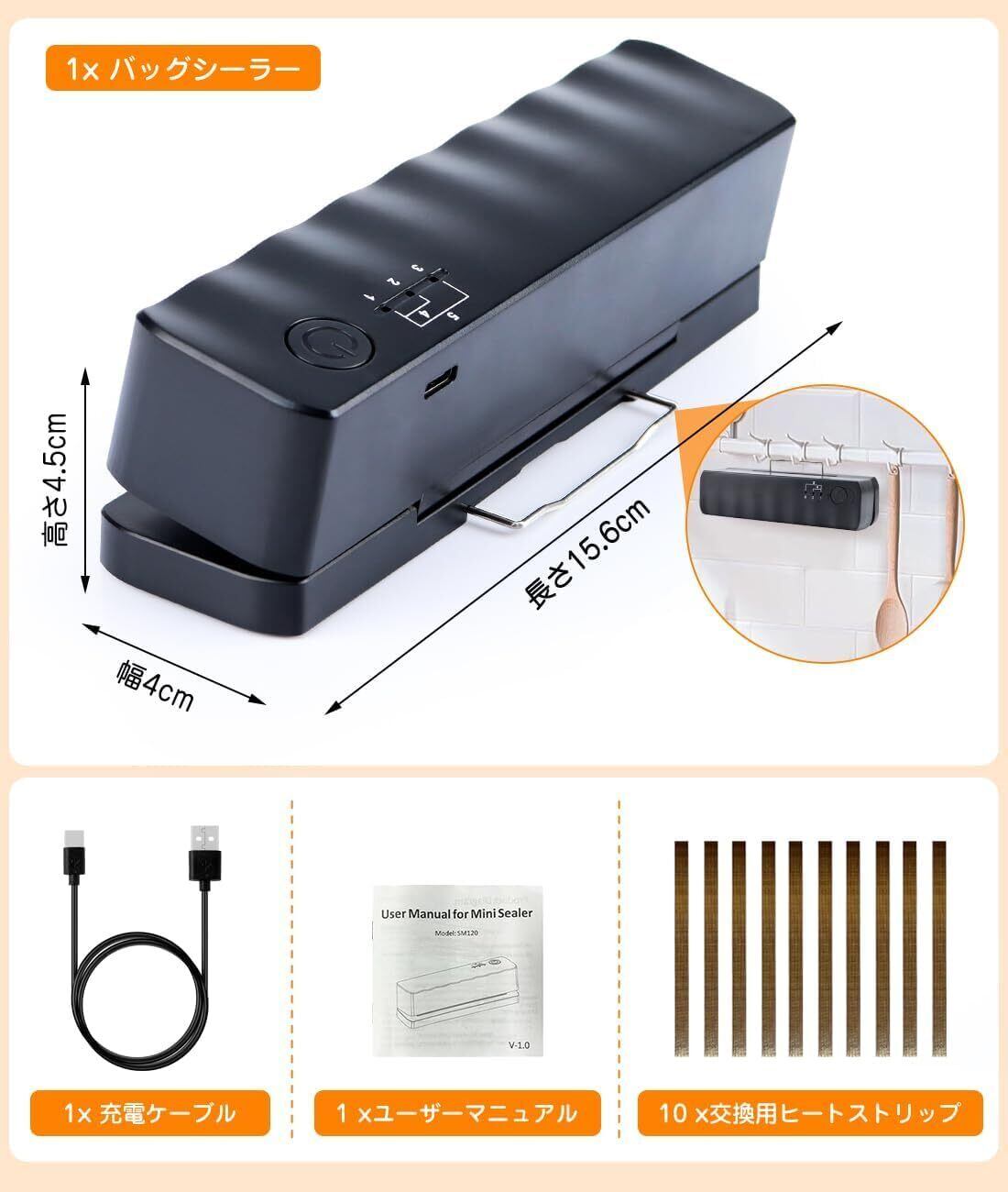 ミニ シーラー バッグシーラー ミニUSB充電式フードシーラーマシン 家庭用 ヒートシーラー 5段階の加熱レベル付き 3000mAhバッテリーと4.7インチの加熱ストリップシール フードシーラー クリップ シーラー 食品スナックバッグ収納用 ハンドシーラー ハンディシーラー 密封機 小型 予熱不要 断熱ストリップ10枚 日本語取扱説明書付き (黒い)