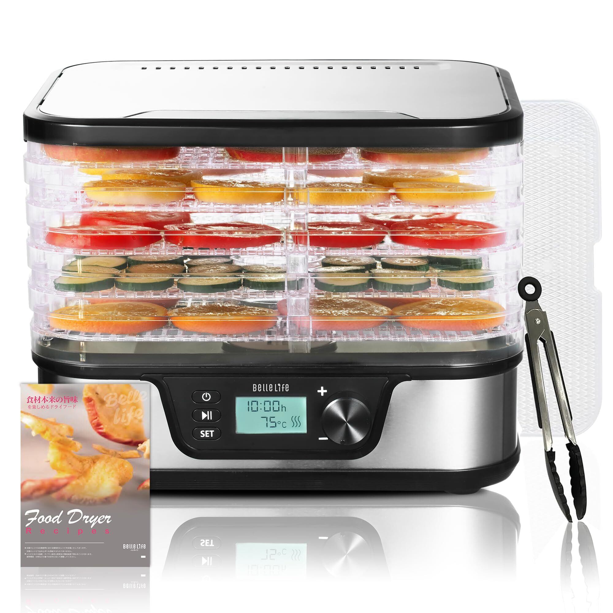 BelleLife フードドライヤー 食品乾燥機 ドライフルーツメーカー ドライフードメーカー新しいアップグレード 野菜乾燥機 電気食品脱水機 5層大容量 無添加おやつ ドライフードメーカー 【専用レシピ&専用マジックシート】 最大8段まで拡張 6層・7層・8層(トレイ購入必要)BLF-400LCD-B