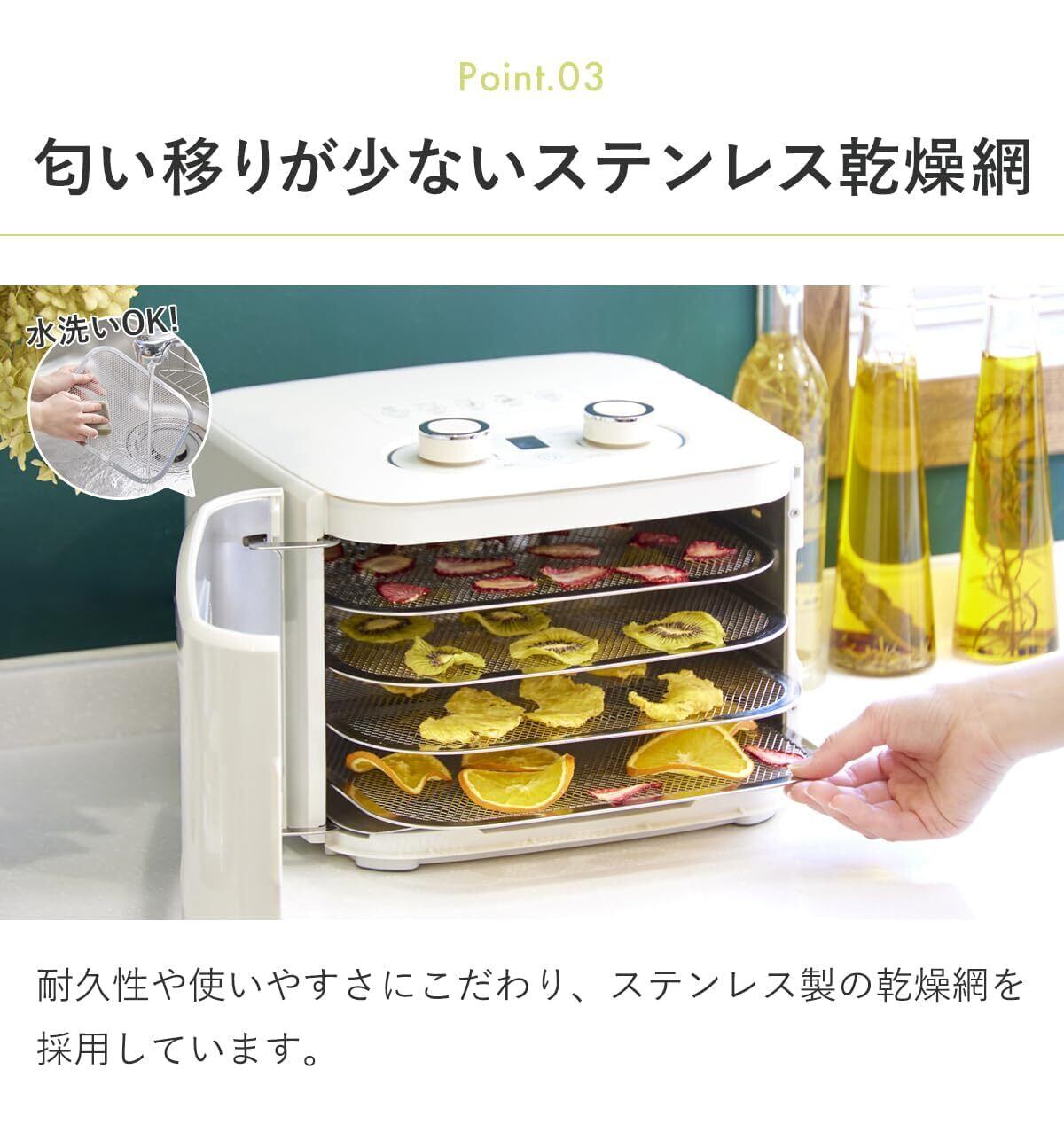 ✨4段のトレーを搭載しているため、多種多様な食材を一度に乾燥でき、時間と手間を大幅に削減!均一な温度でしっかり乾燥させるので、どのトレーでも美味しさが際立ちます。