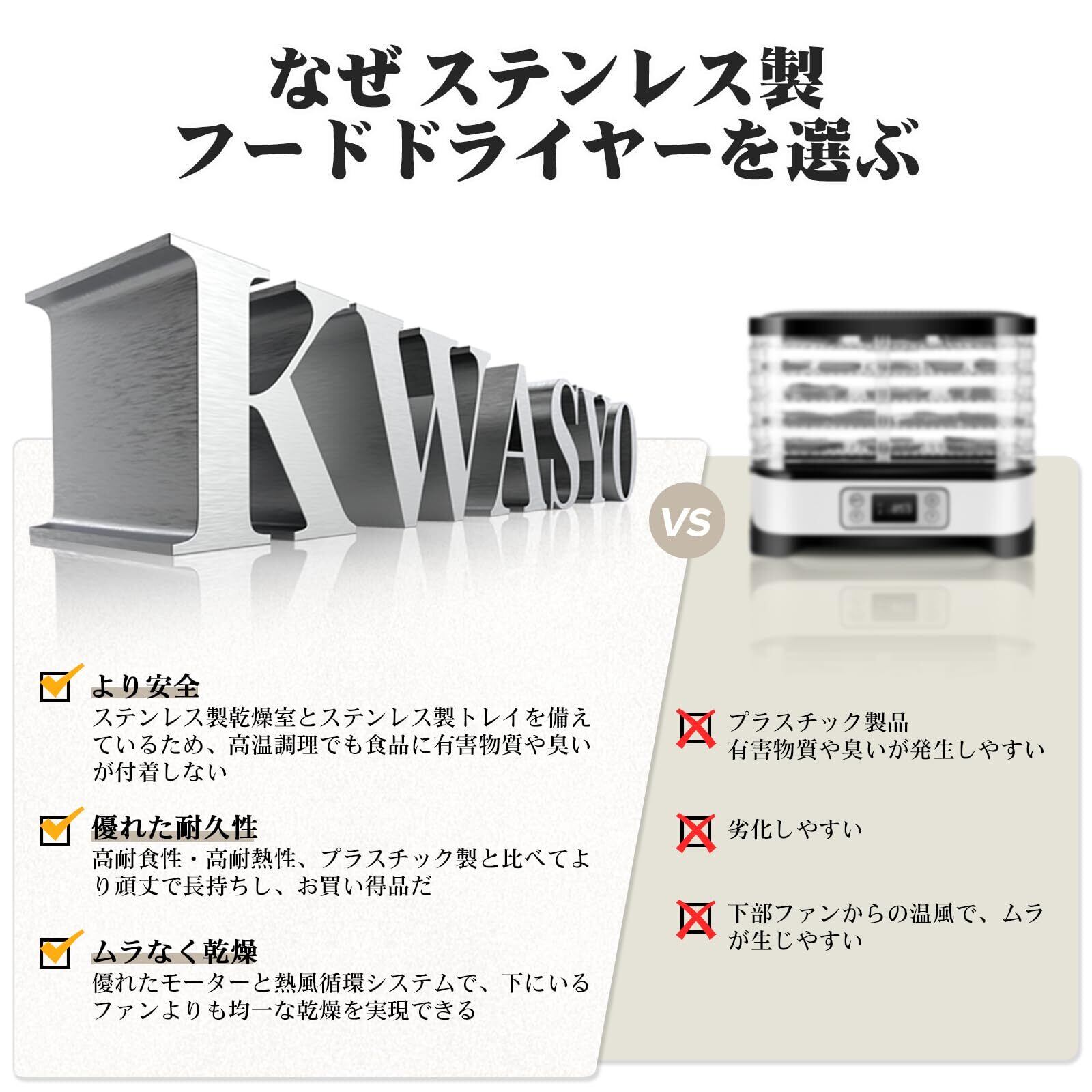 Kwasyo 8層ステンレス鋼制フードドライヤー 700W高効率食品乾燥機 二層構造 30~85℃ 0~24時間自由調節 タイマー付き 過熱防止機能内蔵 受け皿付き 絶熱手袋付き 日本語取扱説明書 日本語レシピ同梱