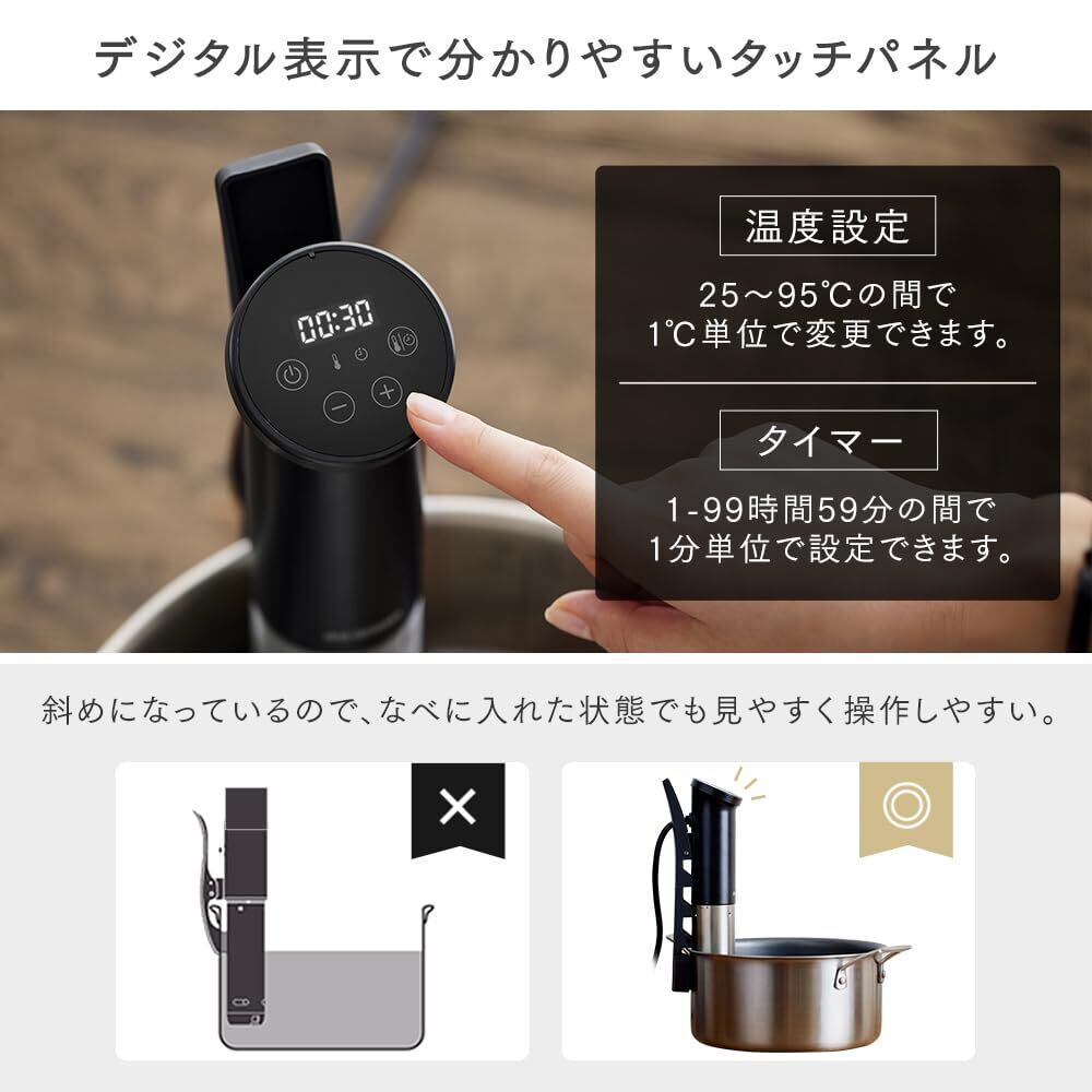 【カラーのブラック】浅型の鍋(10cm以上から対応)でも使える、コンパクトでスリムな低温調理器です。[低温調理とは:高温で加熱するフライパン調理や鍋料理と違い一定の温度でじっくり加熱する事で肉や魚を柔らかく仕上げる調理方法です。][低温調理器とは:鍋の水温を一定に保つ調理器です。低温調理は一定の温度に水温を保つ必要があり、それを実現可能にするのが低温調理器です。]