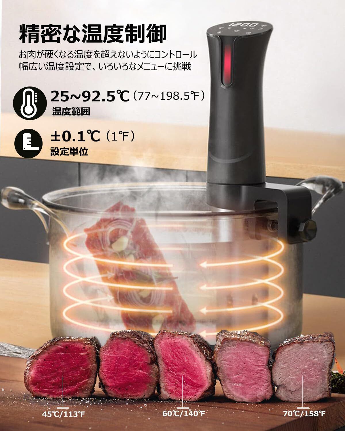 【温度・時間高精度制御システム】この低温調理機はスマートメタル温度センサーが搭載されて、過度調理の心配を気にせず、焦げる心配もなく、最大限食材の栄養素と風味を保留できる。(️火加減が難しいメニューも、おまかせで食材のおいしさを引き出す温度をキープできるので、失敗知らずでつくれます。) *温度設定は25 - 92.5℃まで、精度は±0.1°Cとなる。時間設定は1分~99時間の間(1分単位)で設定可能。