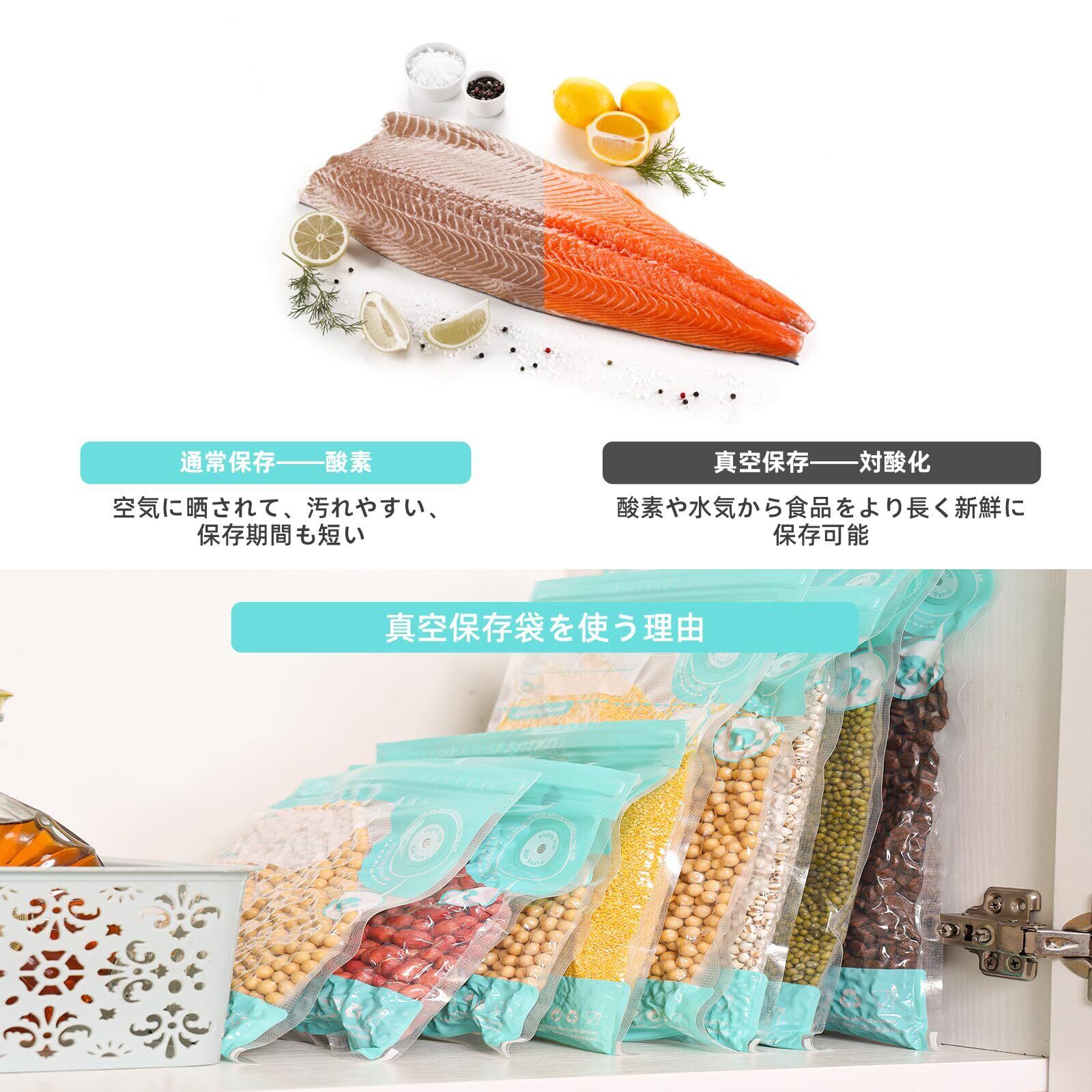 ✨真空パックにより、食品の酸化を防ぎ、冷凍焼けや腐敗を軽減します。肉、魚、野菜、果物など、あらゆる食材の保存に大活躍です。