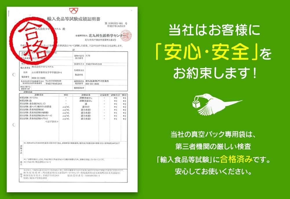 ※当社の真空パックロールは「BPAフリー」です。■BPAとは/BPAは「ビスフェノールA (Bisphenol A) 」というポリカーボネートから作られたプラスチック製品に含まれる化学物質のことです。BPAは人体への悪影響が懸念され「BPAフリー(BPAを含まない)」製品の使用が広まっています。当社の販売する真空パックロールはBPAフリーで安全性の高い製品です。安心してご使用ください。