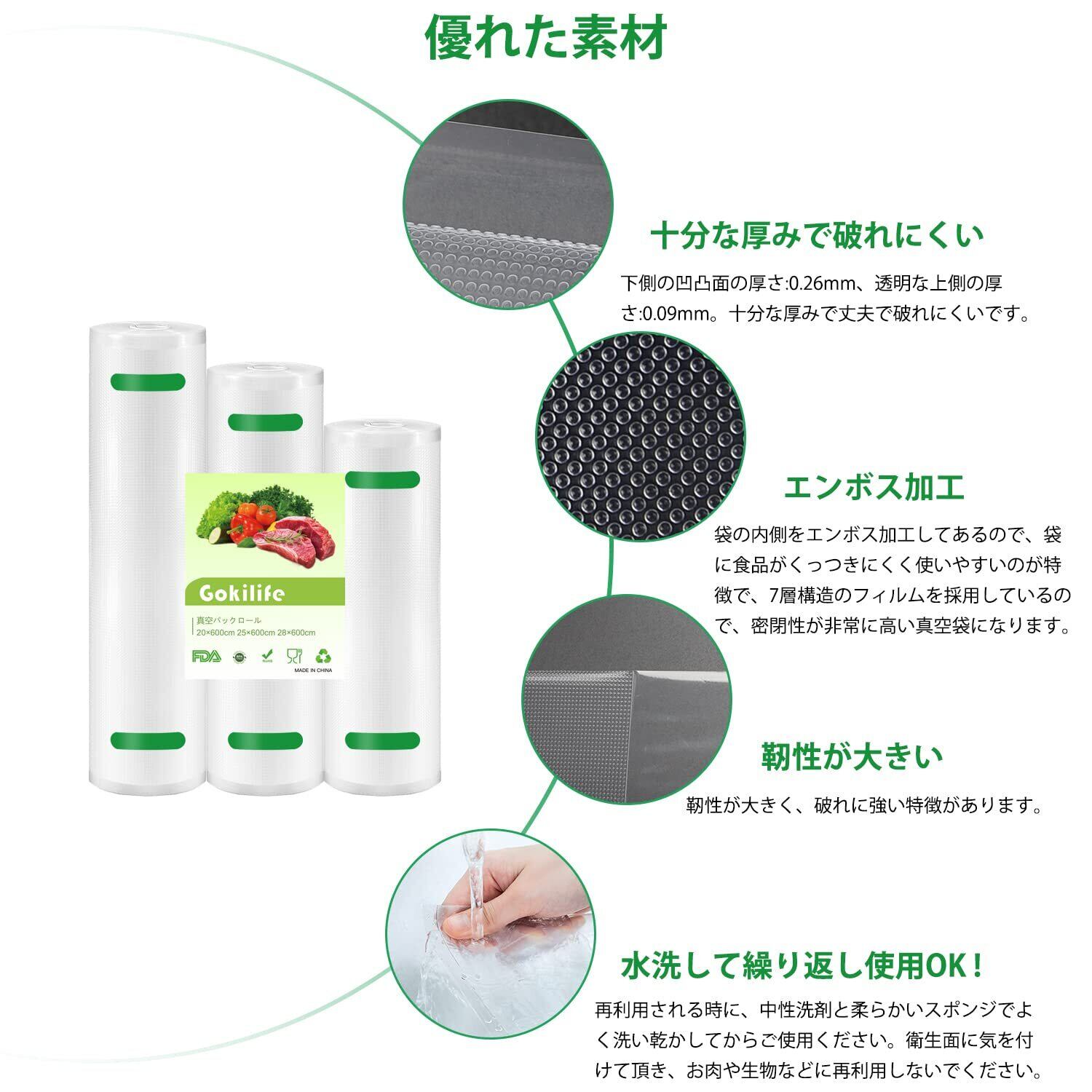 Gokilife 真空パック袋 真空パック ロール PA+PE安全素材 20*600cm 25*600cm 28*600cm 3本セット フードシーラー 真空パック機専用ロール 替えロール 真空ロール エンボス加工 脱気 密封 専用抗菌 鮮度長持ち 食品保存 冷凍保存 電子レンジ解凍 低温調理 家庭用 業務用