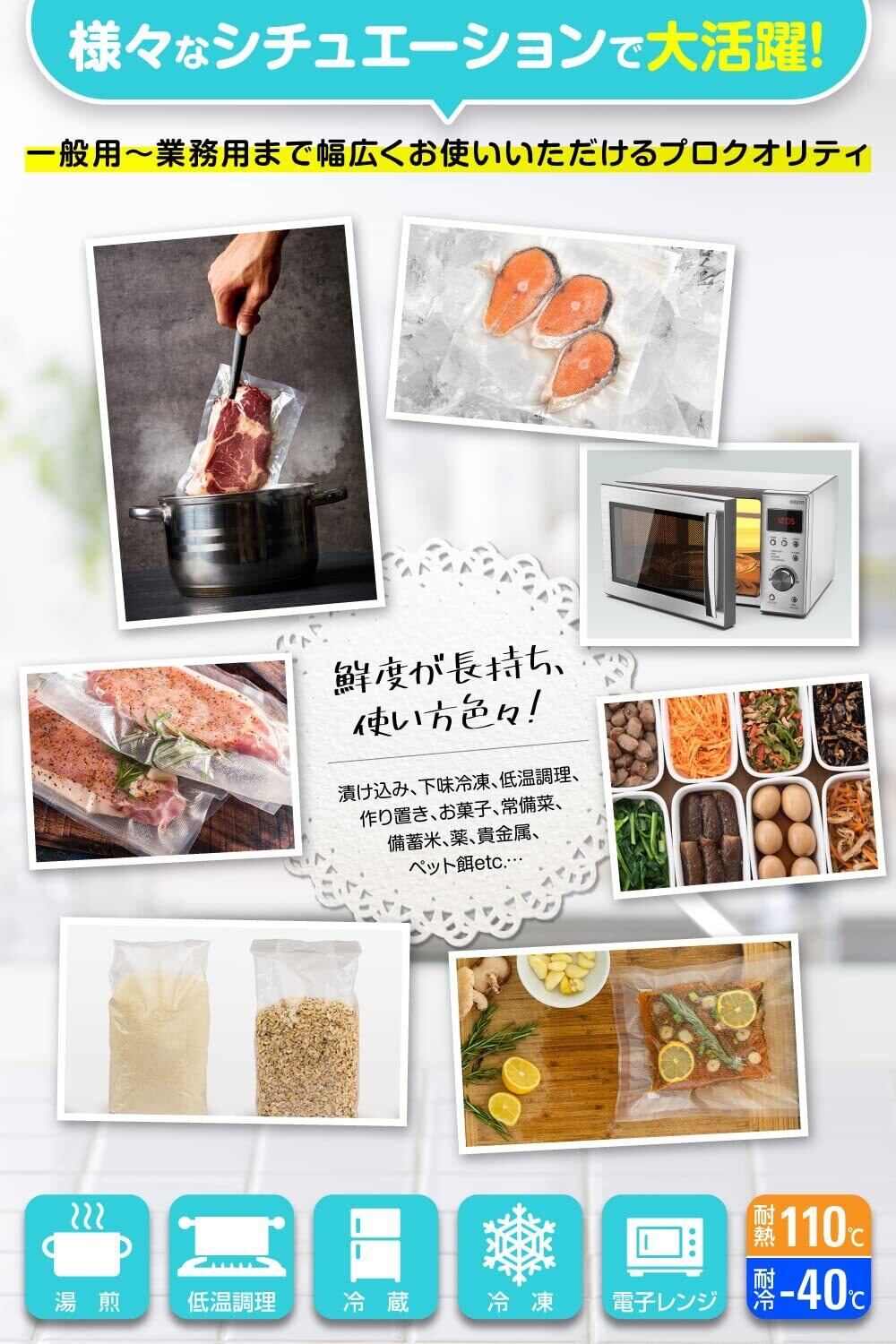 【ご使用用途】お肉やお魚、野菜、お米などの一般食材はもちろん、お料理の下ごしらえ、作りおきのお惣菜やコーヒー豆からペットフード、非常食、装飾品の保管まで、黒ずみとなる酸化を抑えしっかりと保存いたします。 また、保存だけでなく「防臭・防漏 」効果で持ち運びにも便利で開封用切込み口付きなので中身もさっと取り出せます。 バーベキュー、お料理教室、ホームパーティー、飲食店、差し入れ等、様々な用途でご使用いただけます。 湯煎、冷蔵、冷凍、低温調理、電子レンジなど幅広くお使いいただけますので、一人暮らしからファミリー用、業務用までジャンルを問わずご活用いただけます。 ※注意事項※ 発酵食品(パンやチーズ、生ラーメンの生地など)や、ガスが出やすい食料品(煎ったばかりのコーヒー豆、生の野菜、バナナなど)は、そのまま真空パックにすると、袋の中でガスがたまって袋がふくらむことがあります。これは袋に穴が開いているわけではなく、食べものから出たガスなどが原因となります。こういった食品は、初めに個別で冷凍し、真空パックをしてから、さらに冷凍保存をしていただくことで、袋が膨らむのを防ぎ保存することができます。
