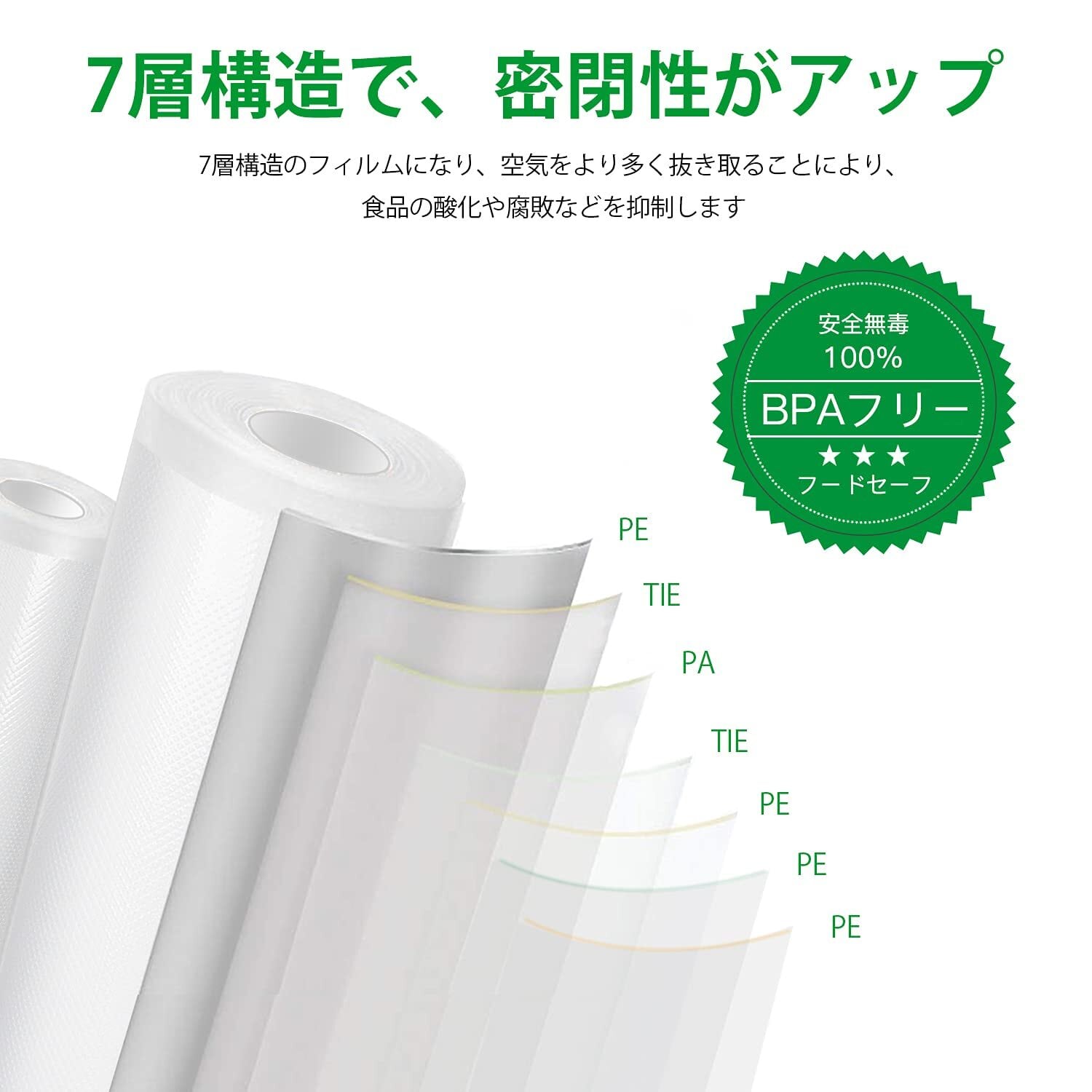 ✨FDA認証を取得した食品グレードのPA+PE素材を使用し、BPAフリーで無毒・無臭。安心して食品と直接接触させることができ、電子レンジでの解凍や低温調理にも対応しています。