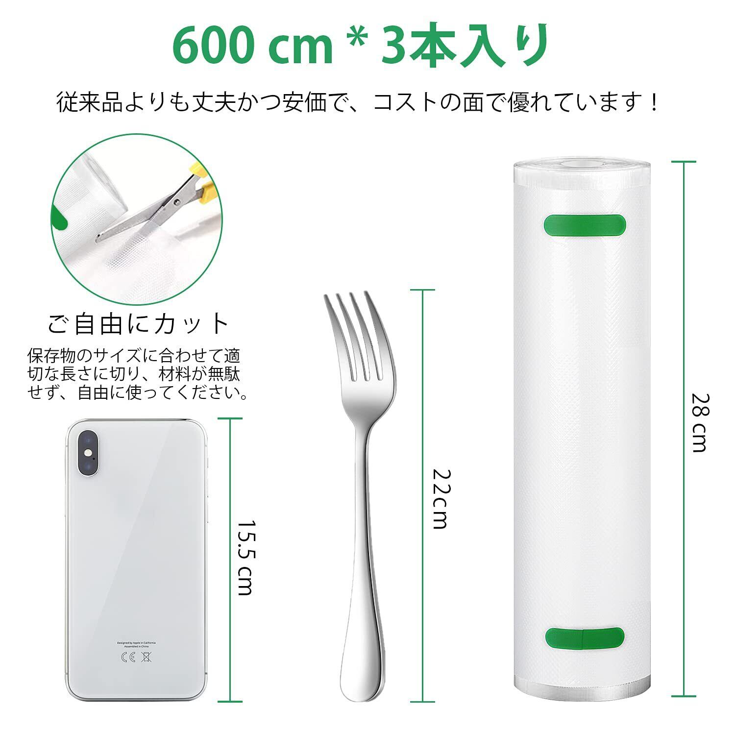 【自由にカットでき】 サイズ:28*600cm*3本 重さ:約950g 耐熱温度:110° 耐冷温度:-40°、固定された真空パック袋と違って、長さはカッターやハサミで自由に設定することができます。必要とする長さを決めて、無駄に使った材料を減らしましょう。