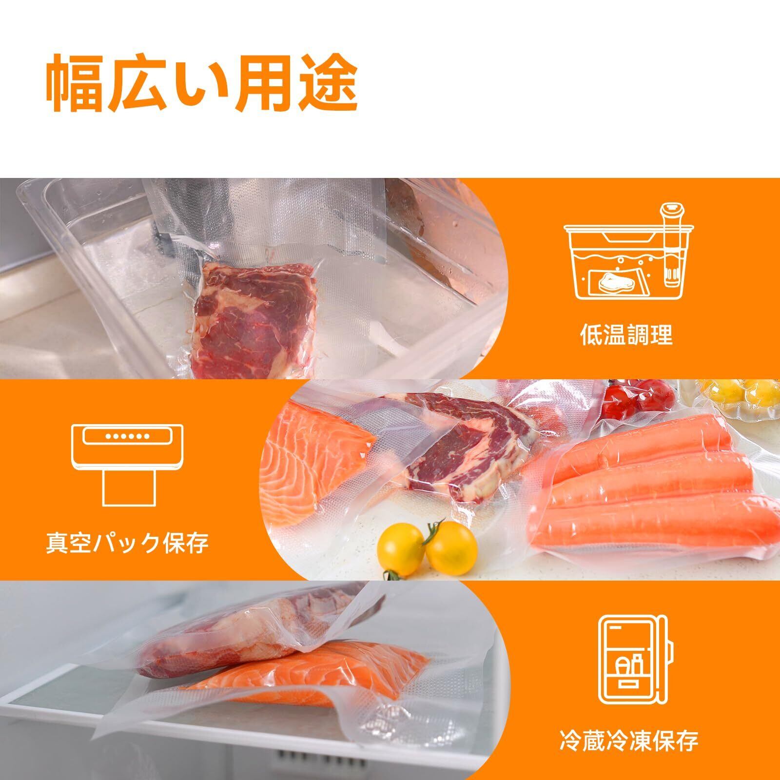【幅広い用途】家庭用だけではなく、ホテル、寿司屋、冷凍食品屋などで業務用としてもご大活躍いただけます。生鮮食品、お魚、釣り餌、犬のフード、お米、防災用品などの保存するのに最適です。真空袋と真空パック 機は低温調理器で調理するための準備として良きパートナーとなること間違いなしです。