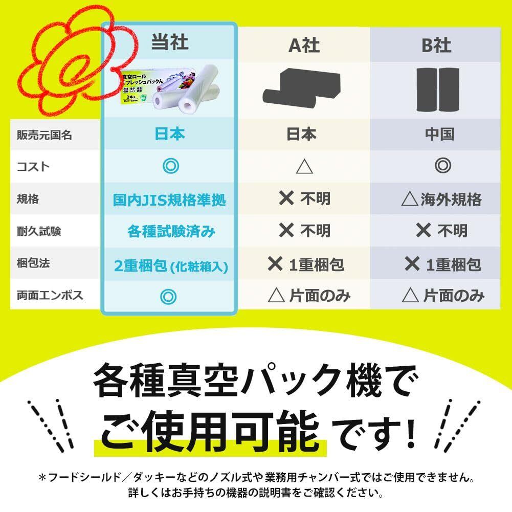 【当社は山口県にある総合通販企業です。安心してお買い物をお楽しみください。】 【お手持ちの各種真空パック機に対応します】 【両面エンボス加工フィルムだから空気や液体を効率よく排出します。】 【電子レンジ解凍OK】【湯煎あたためOK】【冷凍保存OK】【冷蔵保存OK】 【厚さ135μで破れにくく、突き刺しに強い高強度】【様々な品質試験を実施 ■突き刺し強度 ■ヒートシール強度 ■引っ張り強度 ■厚さ測定 ■耐熱検査 ■耐冷検査】 【当社の真空ロールは「BPAフリー」です。BPAは人体への悪影響が懸念されていますが、当社のロールは安心してご利用いただけます。】