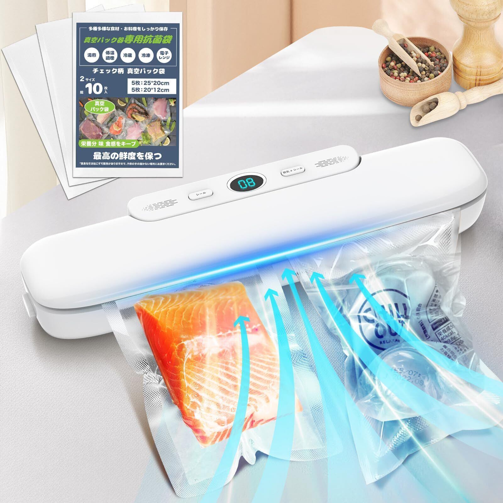 「真空パック機 フードシーラー」は、驚くべき吸引力で食品をしっかりと密封します。真空パックすることで、酸化や劣化を防ぎ、食品の鮮度を長時間保つことができます!